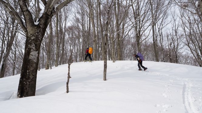 山頂での大休止のあとブナ林を快適に滑降して山之坊に戻る。人気の積雪期コースだが我々以外には誰も来ていなかった。