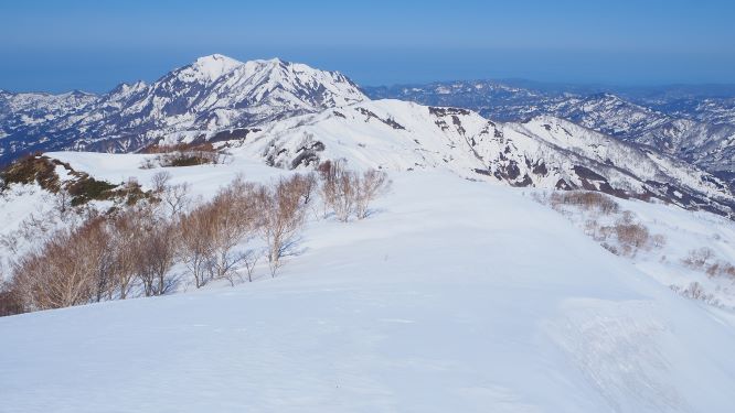 放山(手前)、権現岳・鉾ヶ岳(奥)、そして背後は日本海