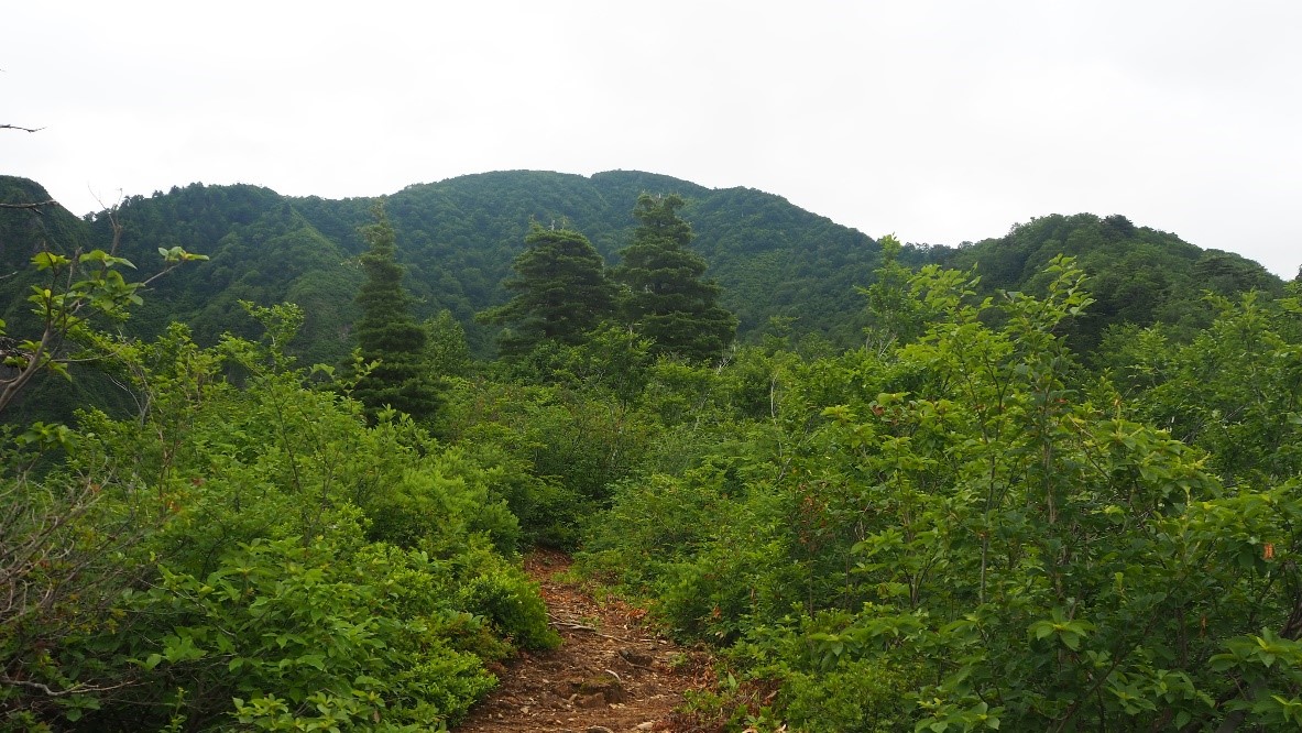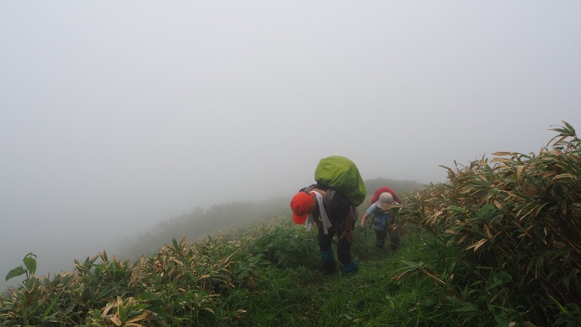 しかし、小兎岳の手前で今度は我々が追い越した。雨に濡れたササヤブをかき分けてビショビショだ。草刈りのありがたさを実感する。