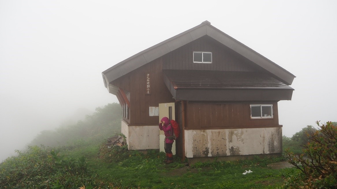 時折小雨が降ったものの雨具を使わず登ってきたが山頂からはガスで何も見えず明日の晴天を期待して小屋に向かう。小屋の中は草刈り作業の人たちが1階を使っていたので2階に上がる。一般登山者は我々のみで2階を広々と使わせてもらった。