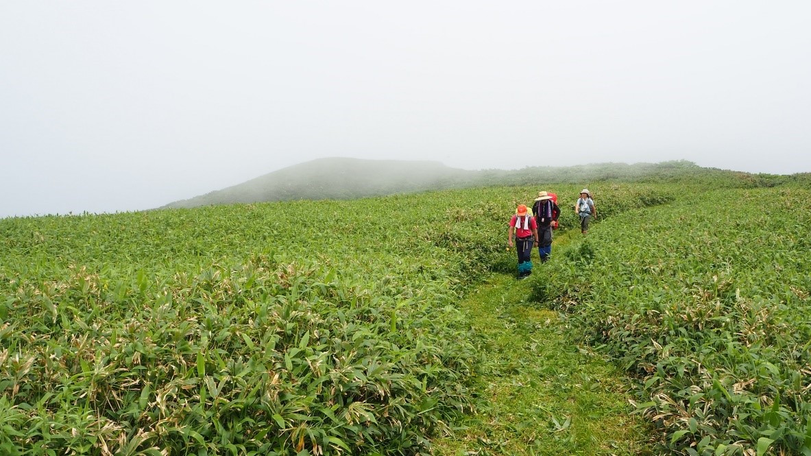 兎岳の山頂に着くころには雨も上がった。さらにうれしいことに行く手のガスの中から刈払い機の音が聞こえる。反対側からも草刈り作業が進められていたのだ。この先は草刈りが終わったばかりの道を気分よく歩いた。