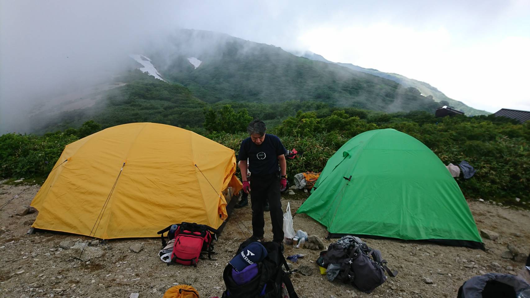 切合小屋に到着。テン場はいっぱいだったけれど、平らな良い所を確保してもらって、6人用と4人用テント2つ並べてはることができた。