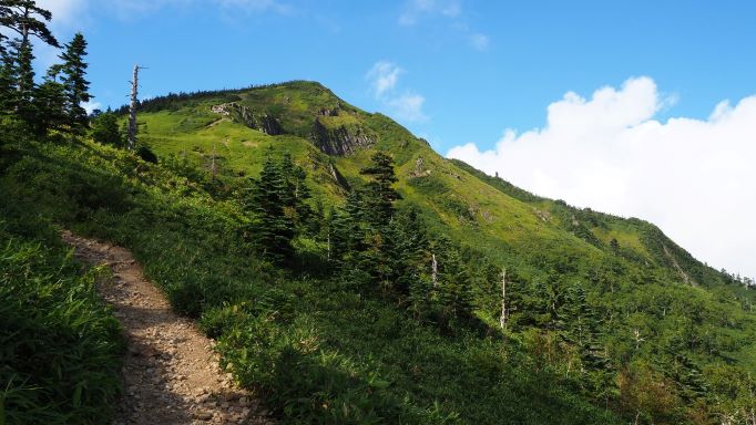 〈裏岩菅 → 岩菅 行く手の岩菅山を越えるとあとは下るのみ〉
