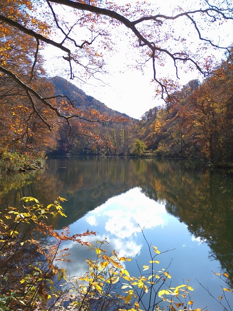 それでも雨生ヶ池は、いつもの姿で、“佇む”という言い方がよく似合う、良い雰囲気。山を映す水面を、30センチくらいありそうな鯉?が悠々と泳いでいた。