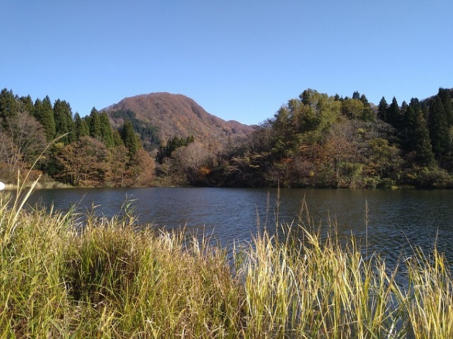 樽井橋まで戻って、今度は大規模工事中の左岸を辿り、大池への散策路を行く。大池は、池の向こうにどっしりした番屋山の山姿を眺めることが出来る絶好のスポット。