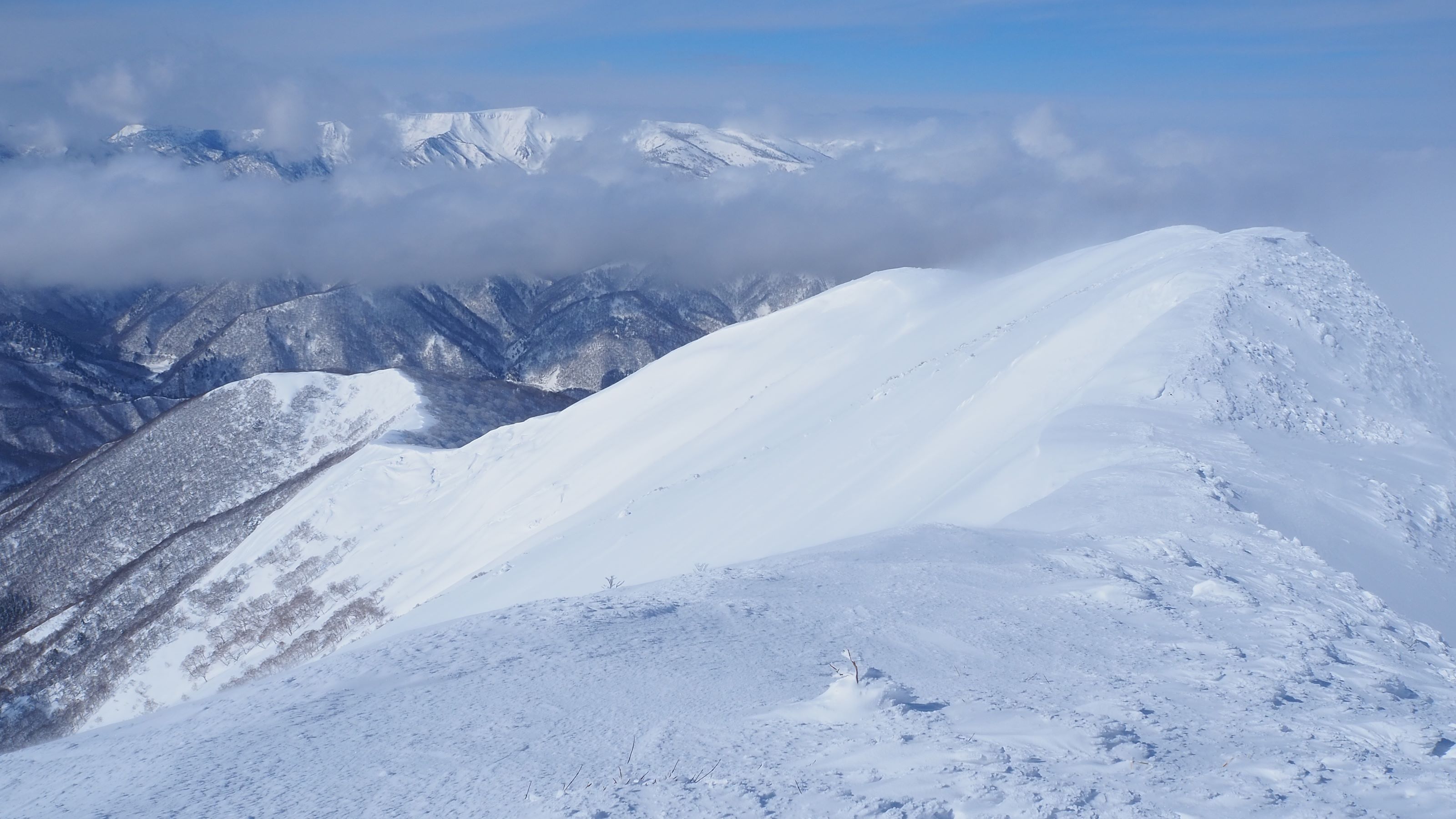 稜線上は強風で積雪は少ないが、登ってくるときは固い雪の上に新雪が40-50㎝ほど積もっていた。天気がよくなったのでヤカイ沢を降りたかったが、3日前の阿寺山の雪崩事故を思うと無理はできない。