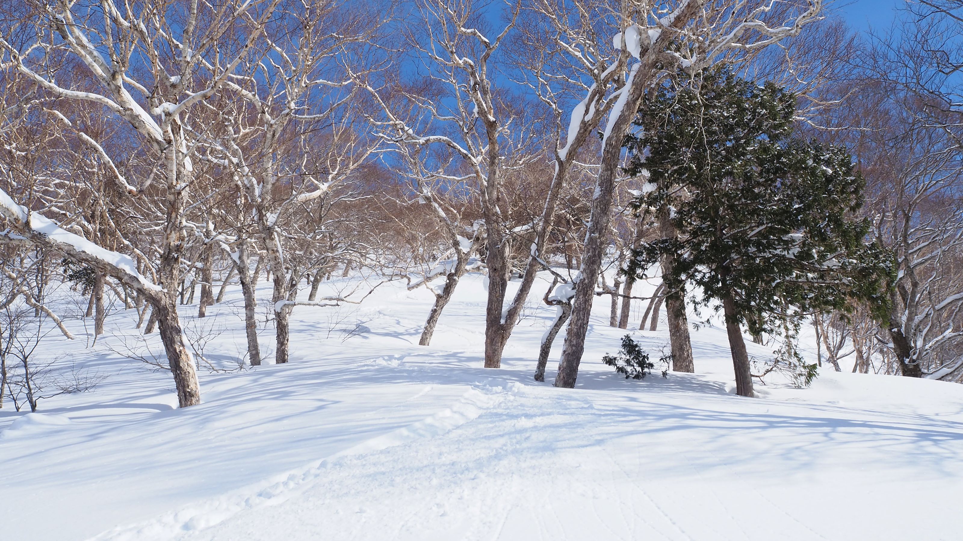 〈ダケカンバの林を快適に滑降〉