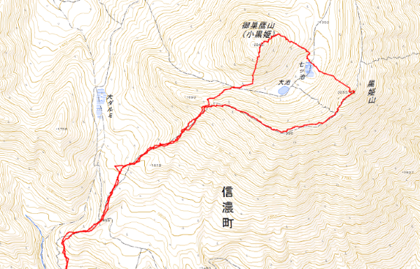ルートは、黒姫山頂まではほぼ夏道通し、山頂からは「七ツ池シュート」とスキーヤーが勝手に名付けた斜面を滑降して、七ツ池があるカルデラ内の凹地に降りる。そこを横断して御巣鷹山の東面から山頂まで登った後、南面から凹地の西端に向かって滑降する。そのあと外輪山を登り返して登りのルートに合流してスタート地点に戻るというもの。