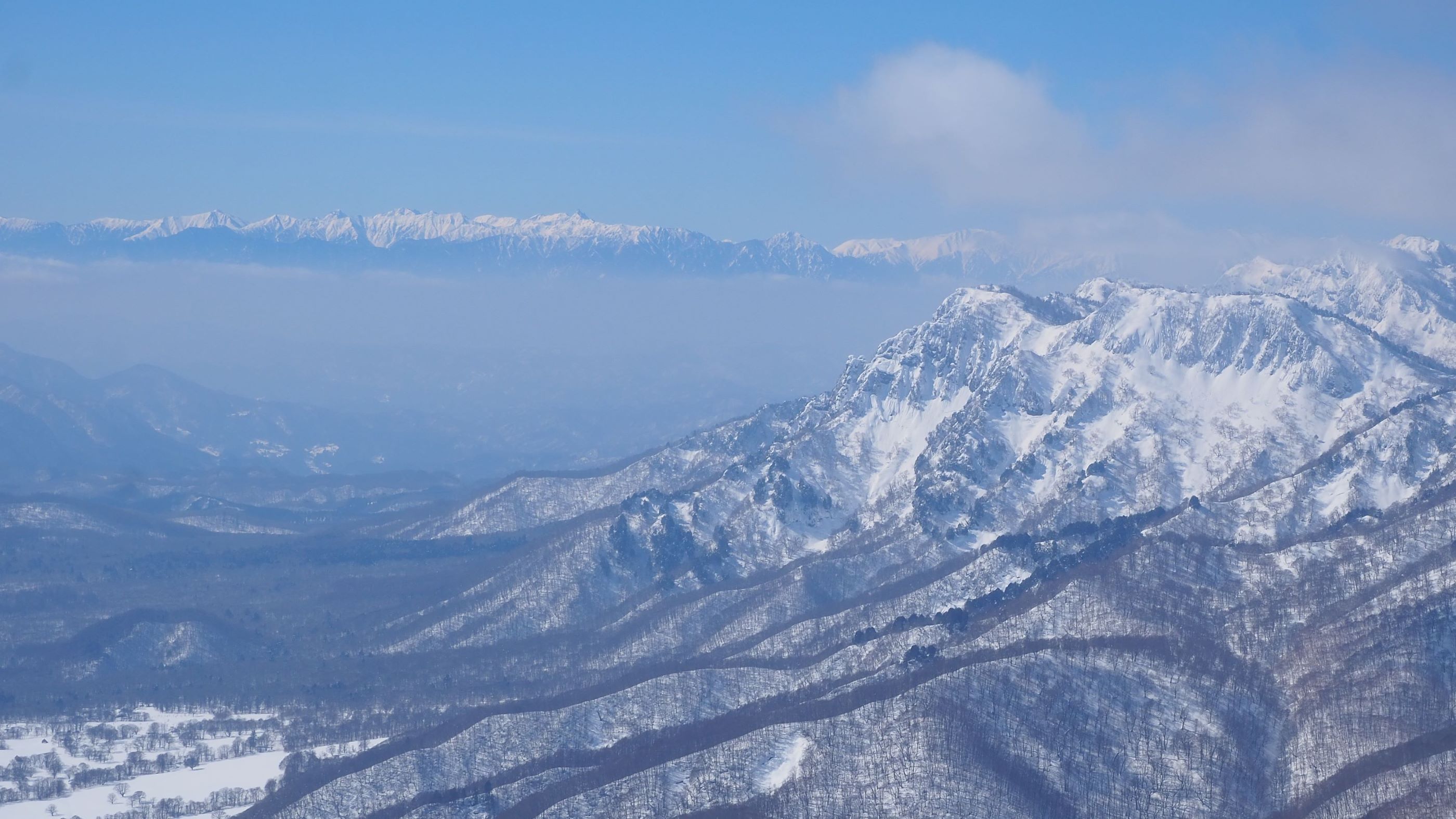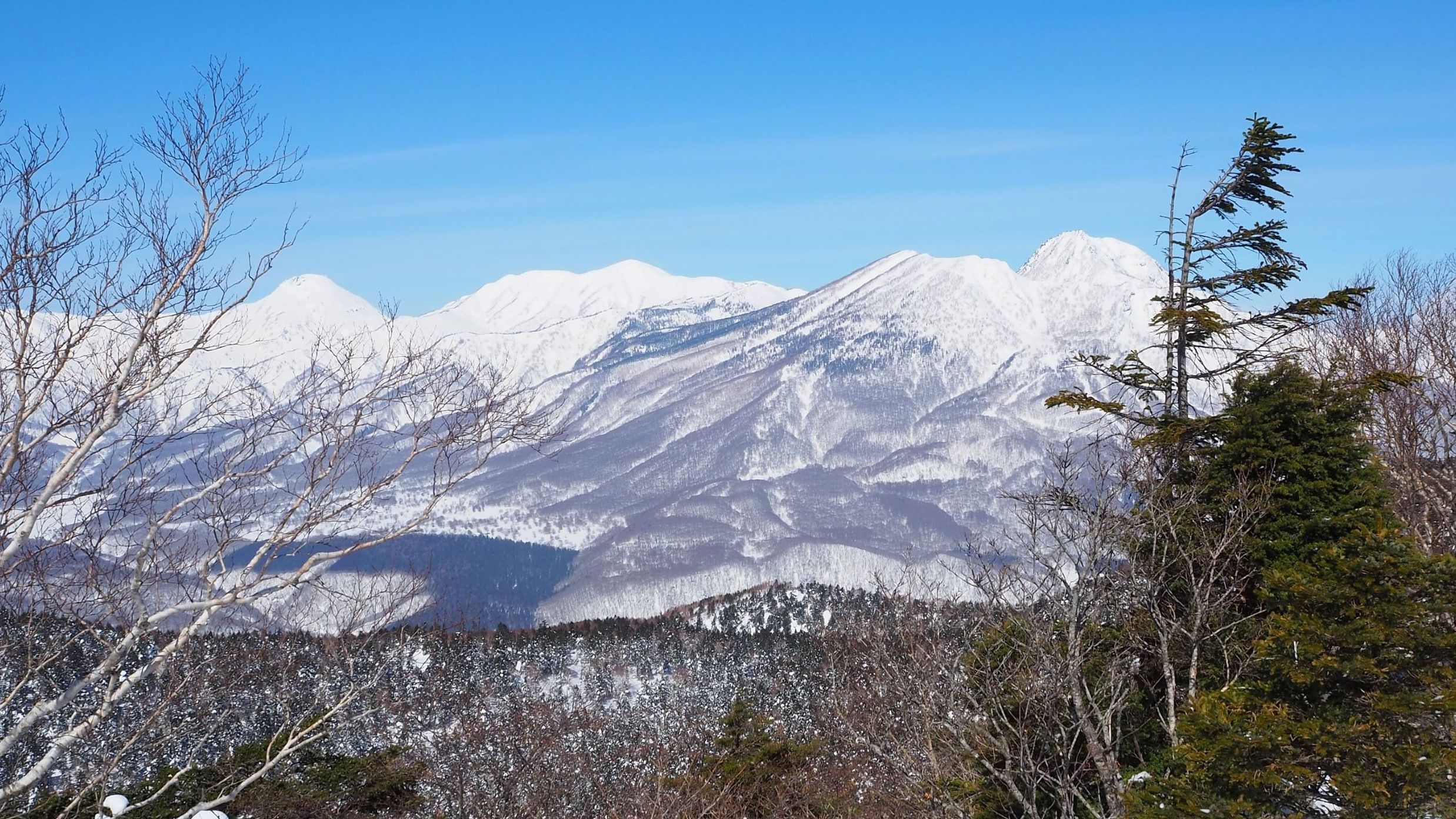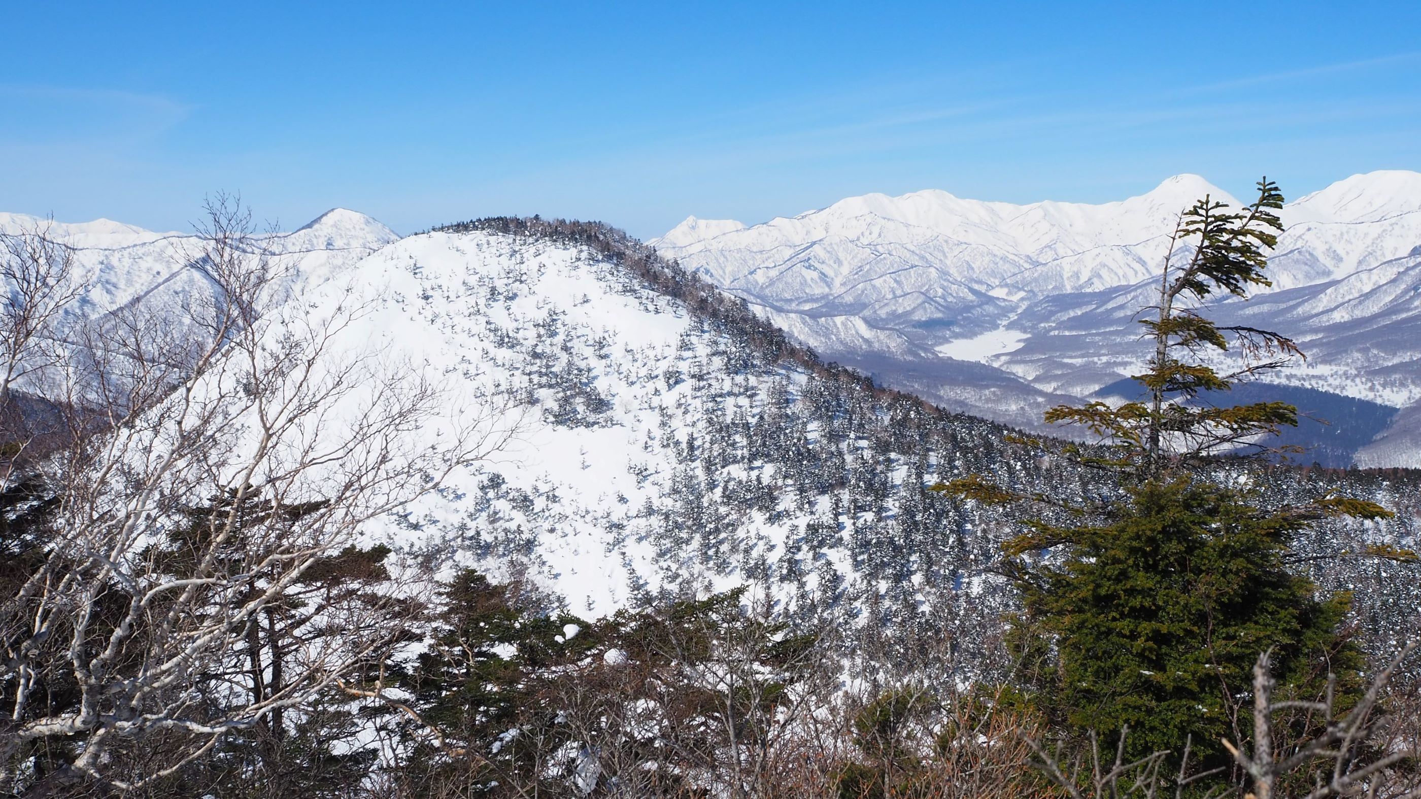 御巣鷹山から、黒姫山頂(中央)、七ツ池がある雪原(下)、