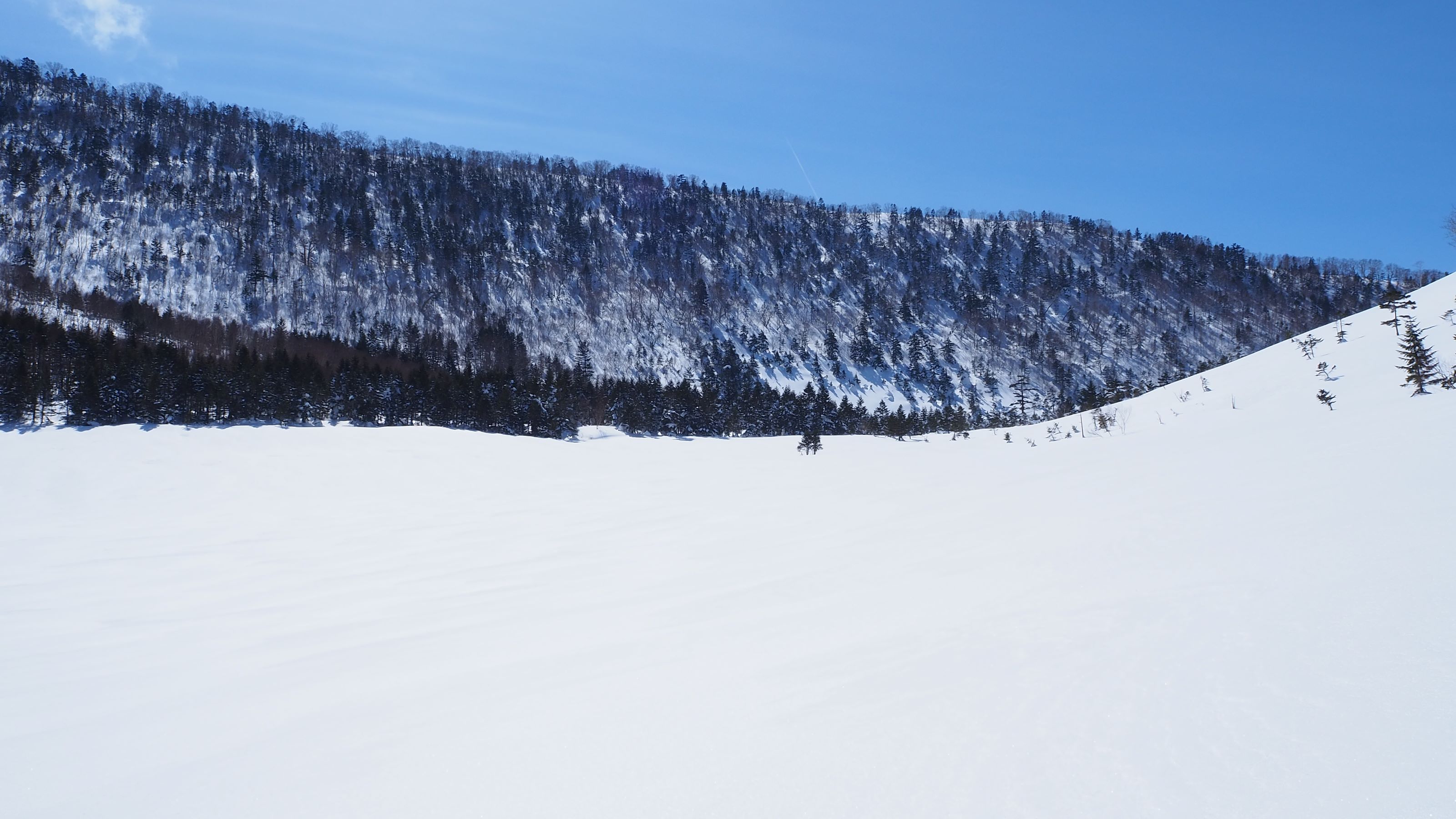 七ツ池、大池のあるササ原は大雪原となっている。後ろは外輪山