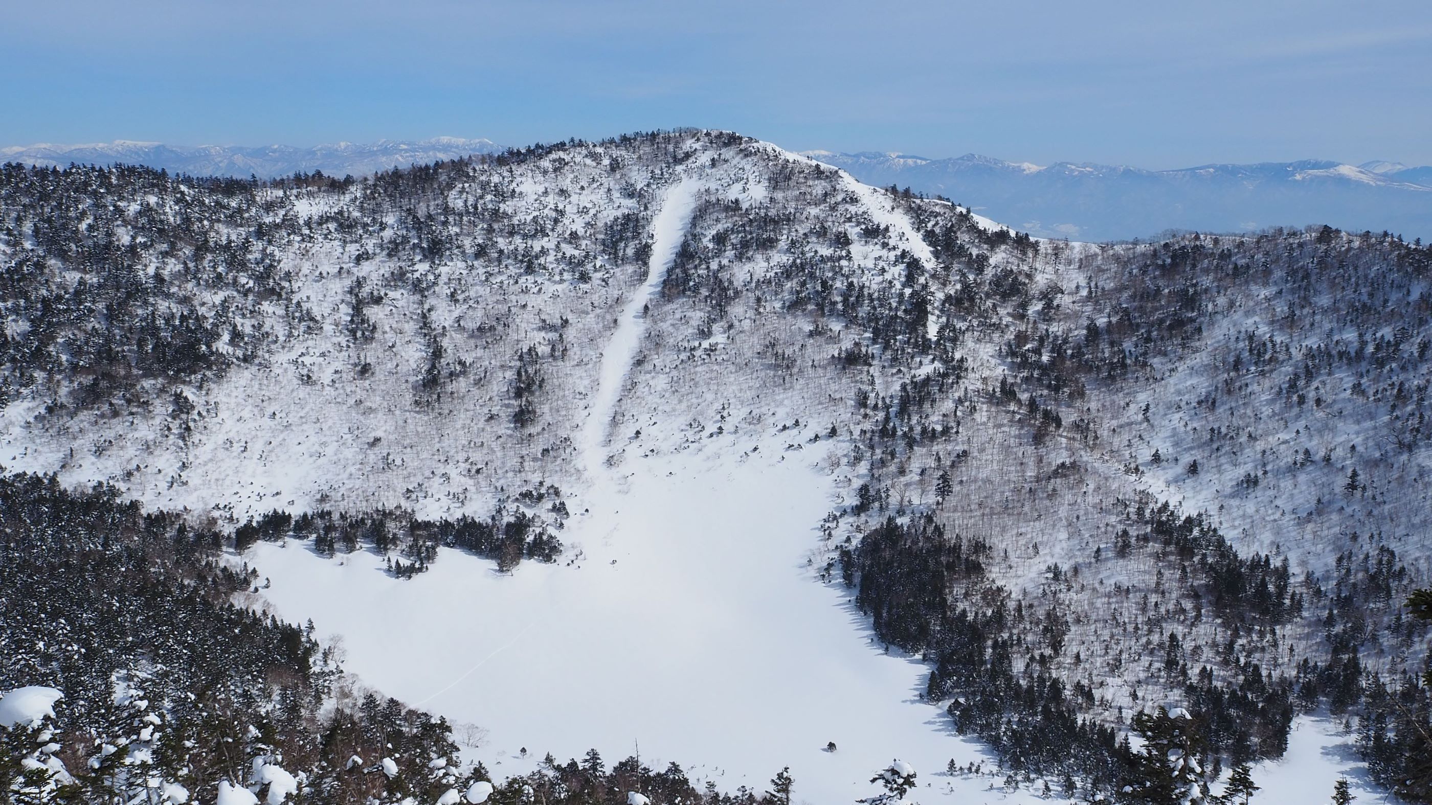 七ツ池シュート(山頂から雪原に続く白い線)