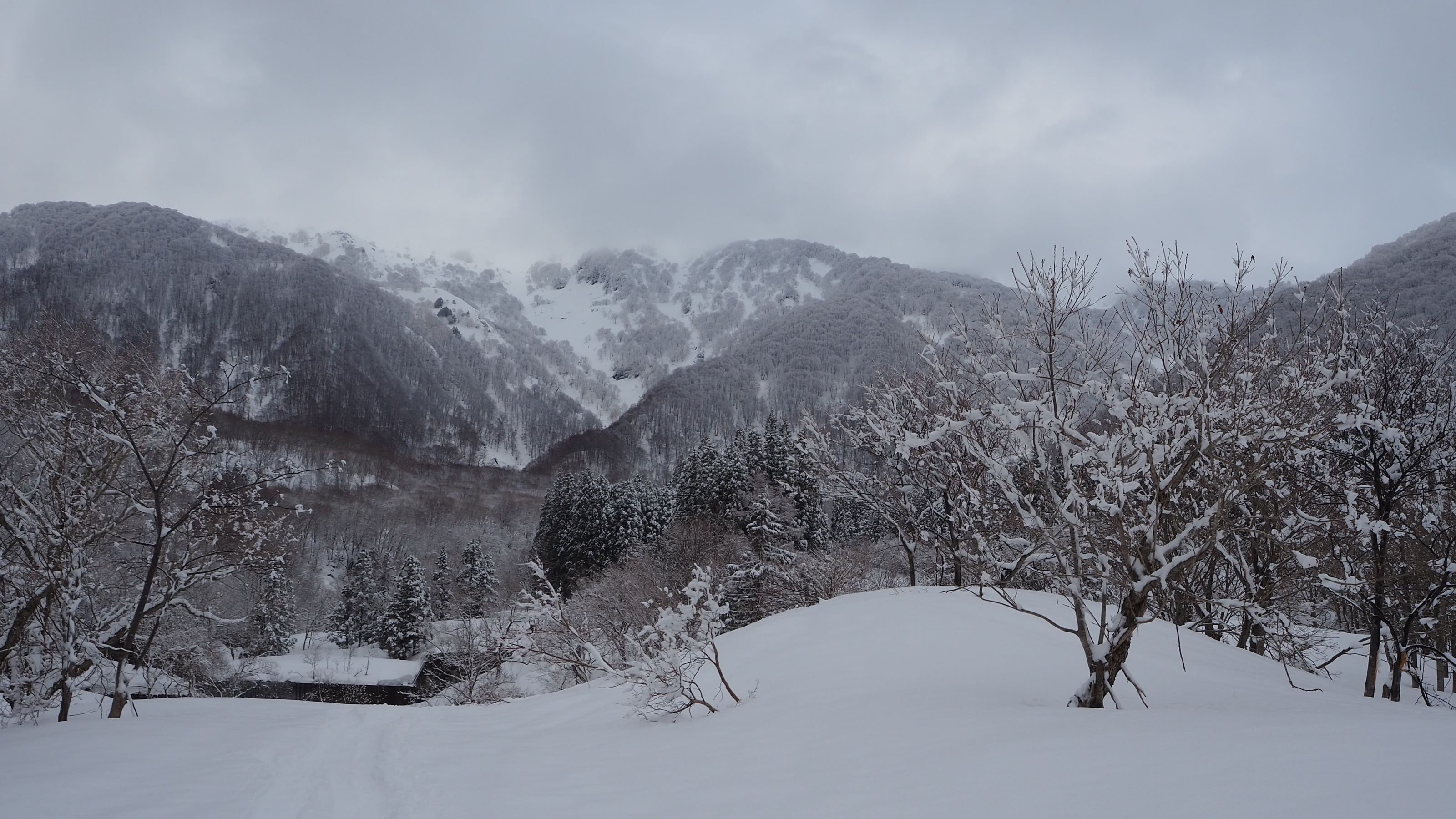 前夜積もった新雪の中、ありがたくトレースを使わせてもらう。