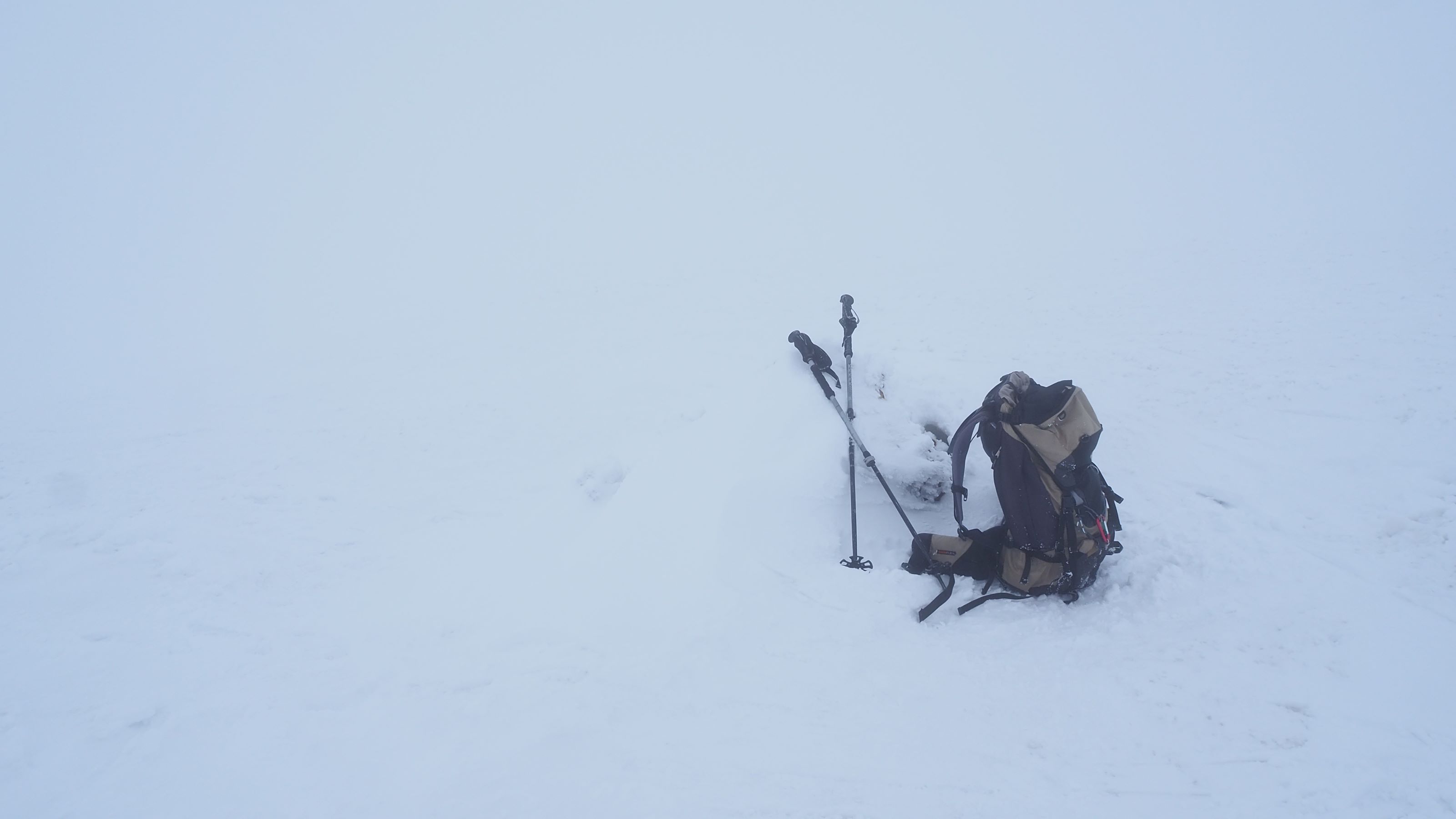 ガスの中GPSを頼りに慎重に下り続ける。ニセ巻の急斜面はほとんど横滑りで降りた。急斜面を過ぎてなだらかな尾根に出るとようやくガスの中から抜け出た。