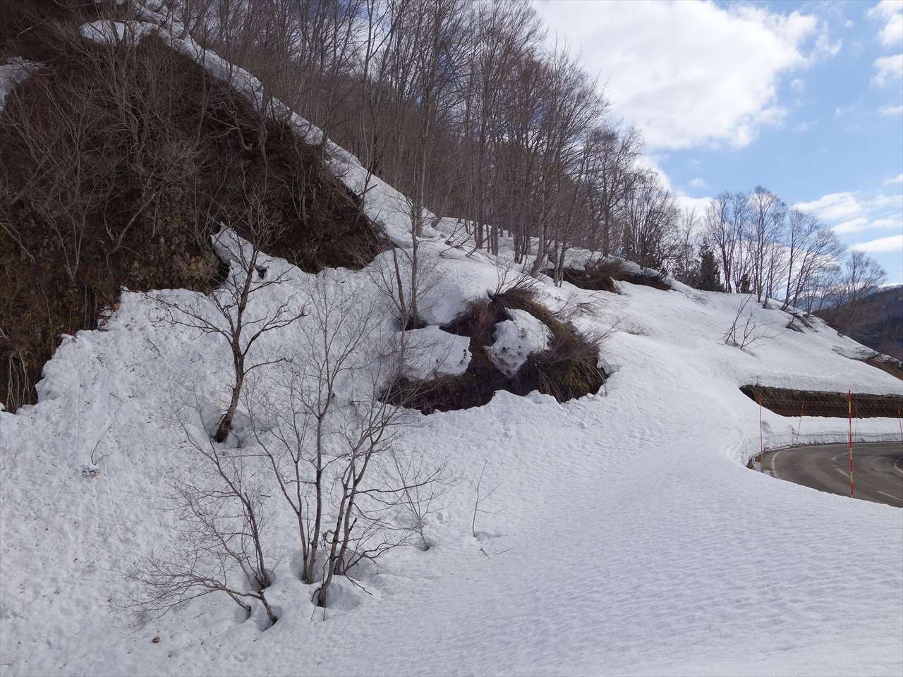 【ジャクズレ沢側の斜面,尾根は雪切れで藪】