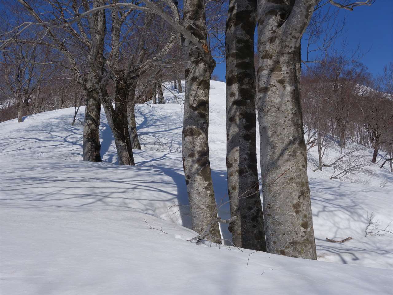 1099m標高点で穴あきブナに挨拶し,昼の憩いをとり1005m三角点ピークの鞍部に滑り込む。