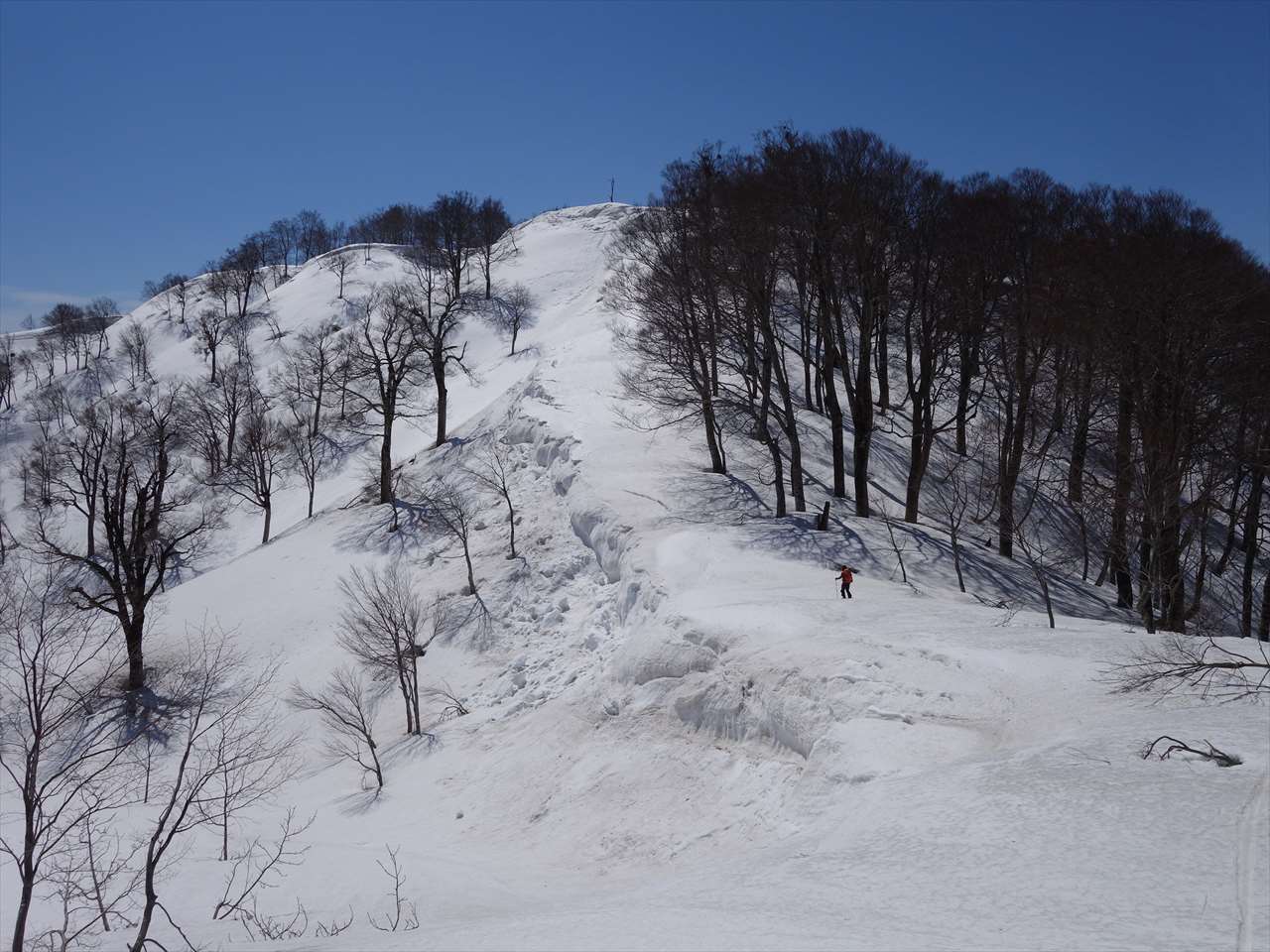 あとはザラメの快適尾根を滑って降りるだけ。