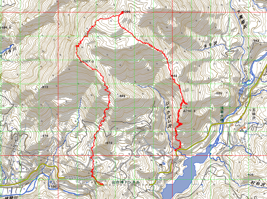 いつぞやの12月は深雪の中,標高差約200mを3時間以上格闘したジャクズレ沢右岸側の尾根からジャクズレガッチに至り,下りはジャクズレ沢左岸側の尾根を周回して戻る作戦である。