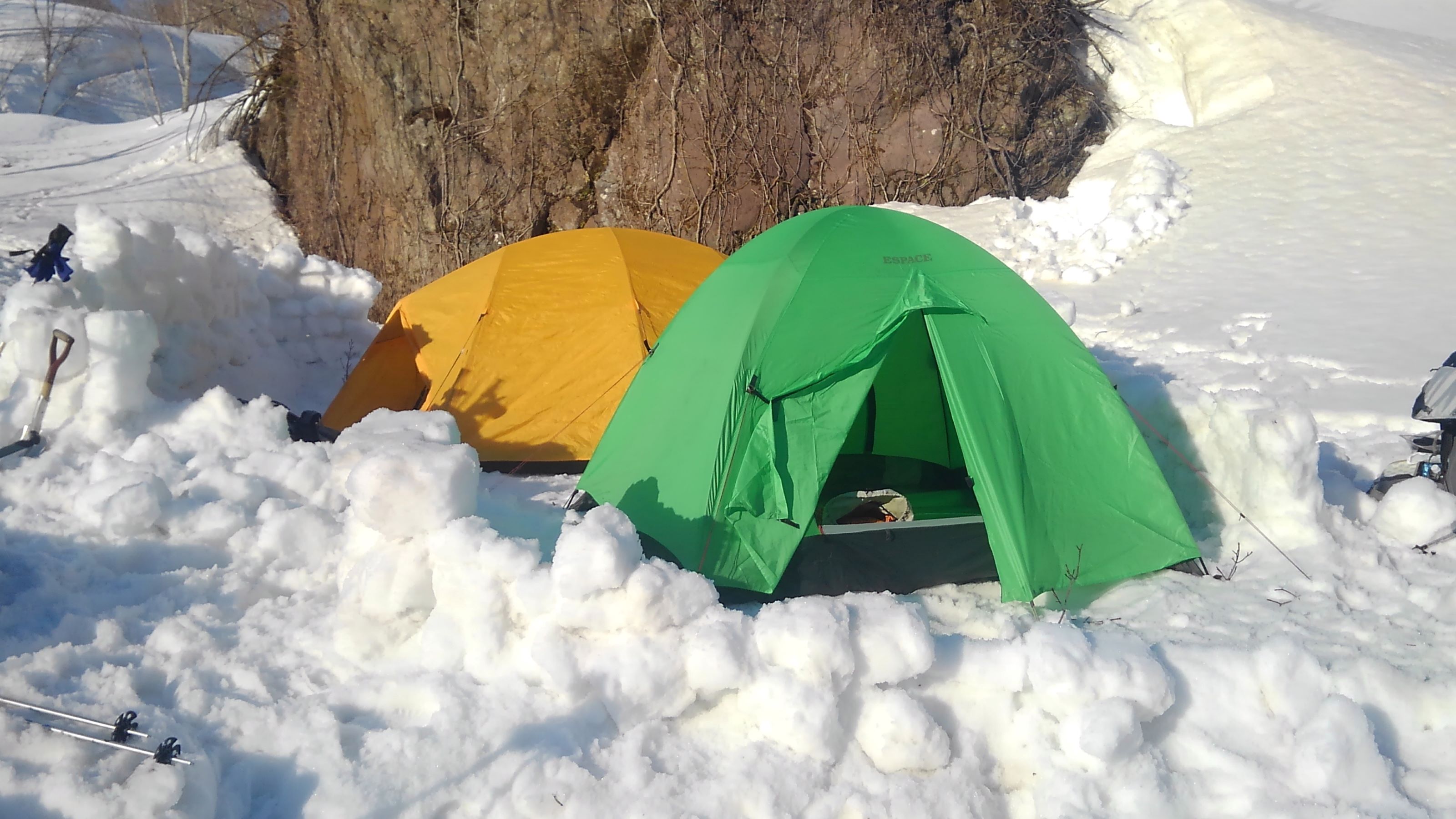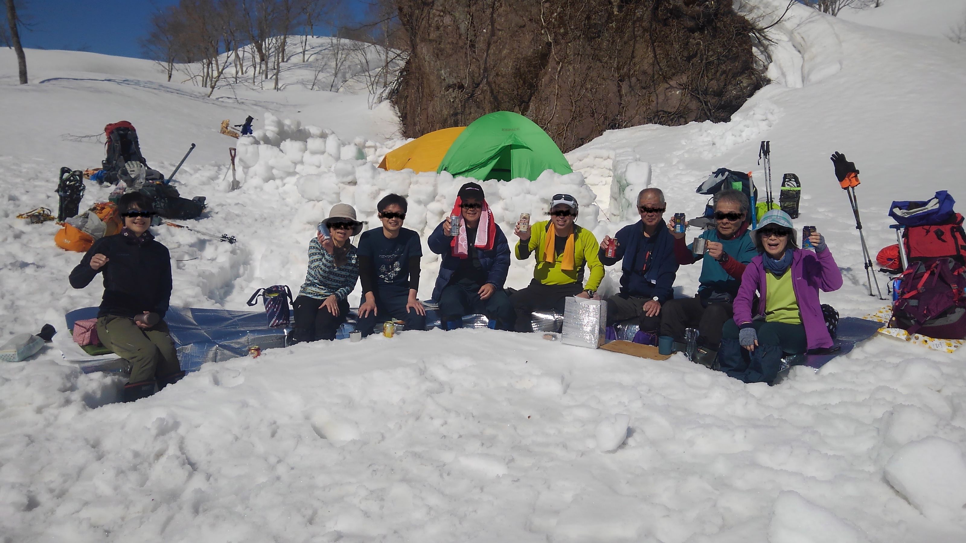会山行 【日 時】2022年4月2、3日(土日) 【メンバー】9人 【天 気】2、3日とも雲一つない快晴 【記 録】2日 アマノ平(980m)でテント設営 3日 空身で1250m付近で焼山蒸気、北面台地の白と青空を堪能する