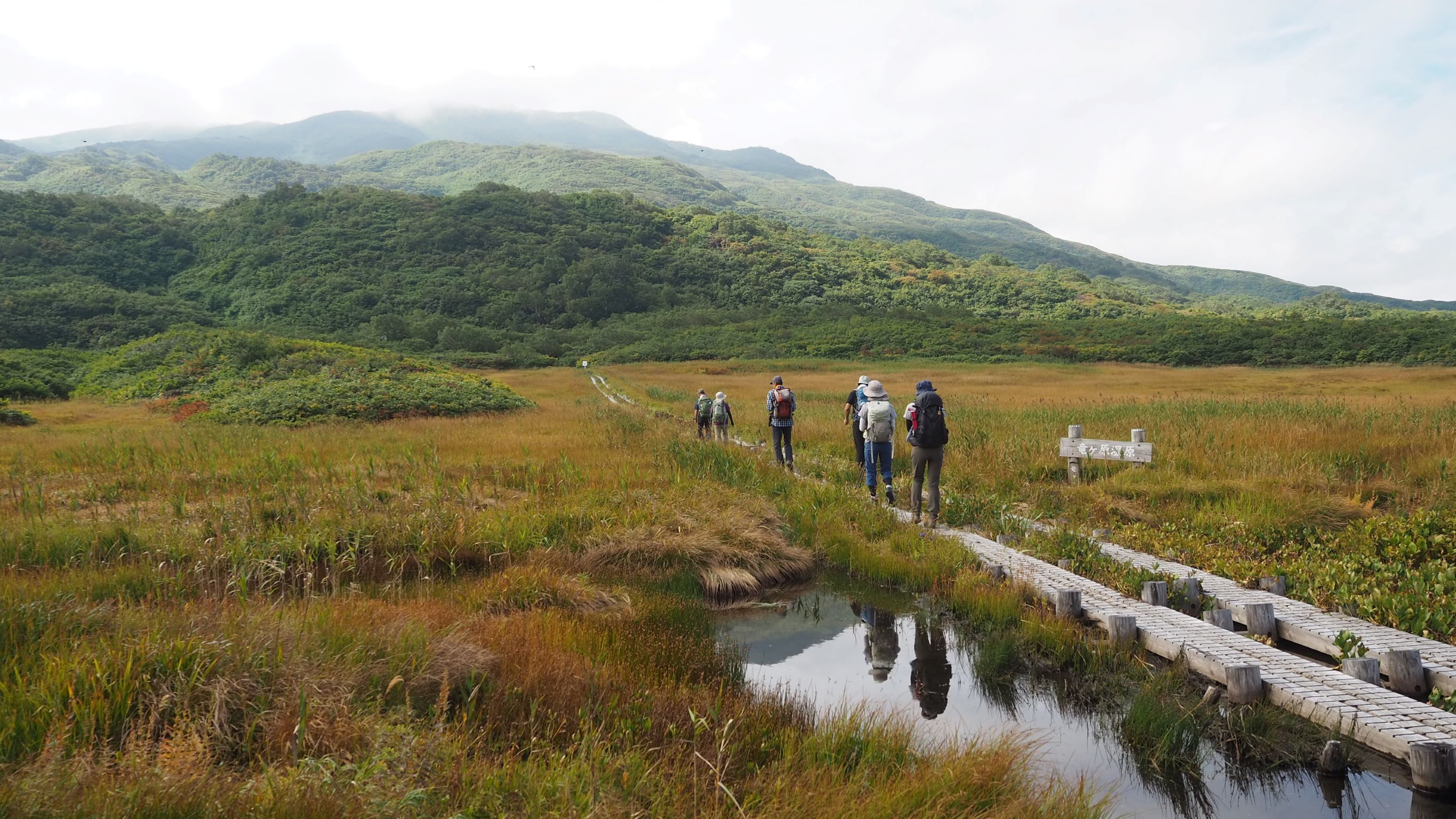 5合目竜ヶ原湿原の木道を行く。正面の鳥海山は山頂付近に雲がかかる