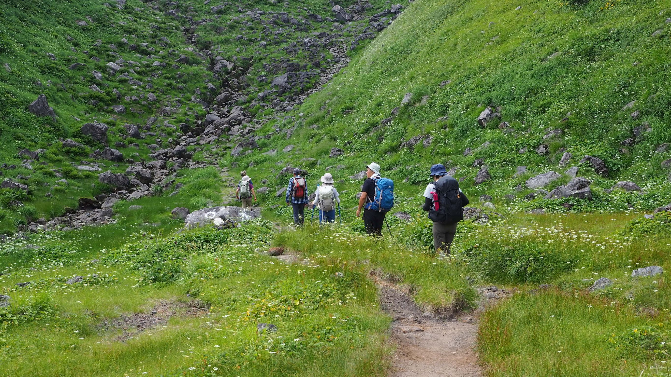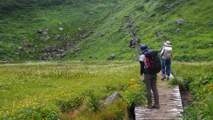 ガレ場を登り色づき始めたイワイチョウの草原を過ぎると大きな池塘がある7合目御田だ。まだ雪が消えて間もないようで名前のわからない白い花が一面に咲いている。9月の半ばを過ぎてもこのお花畑はさすが鳥海山。
