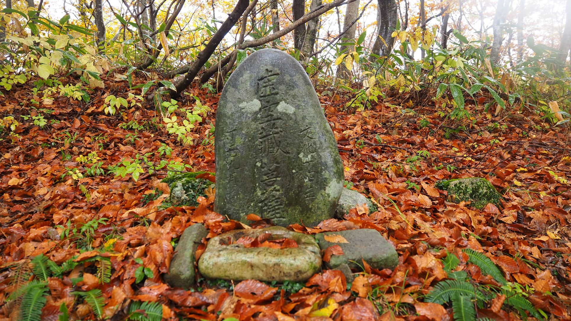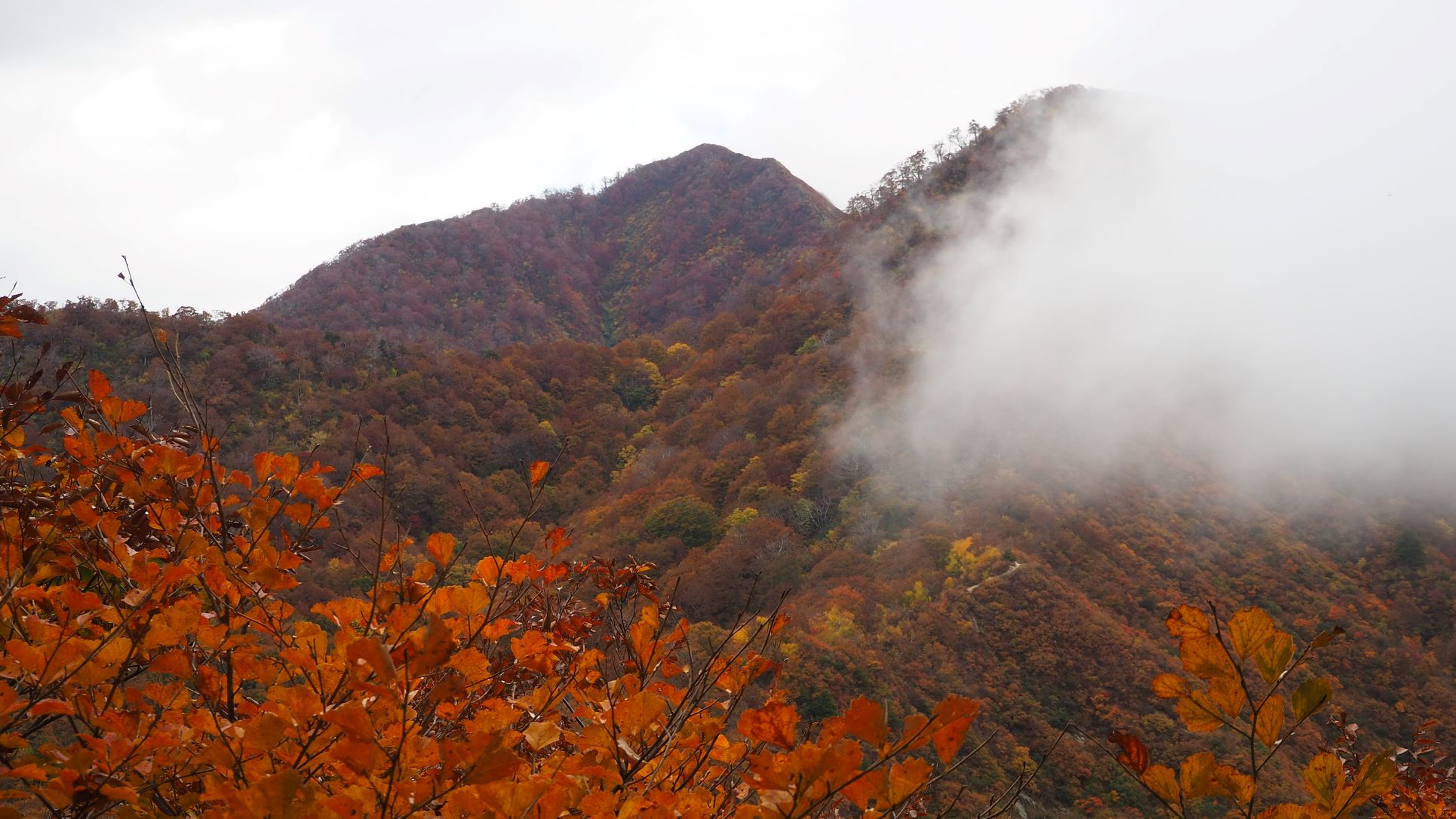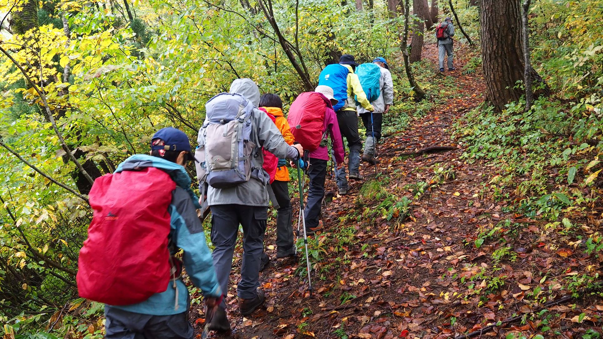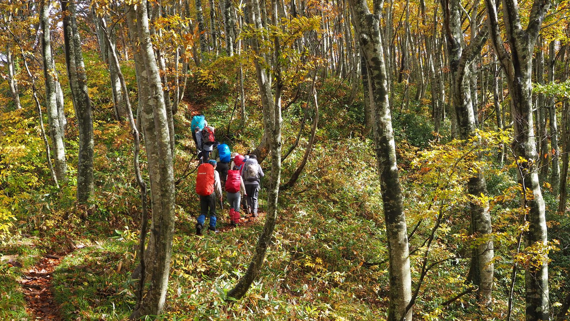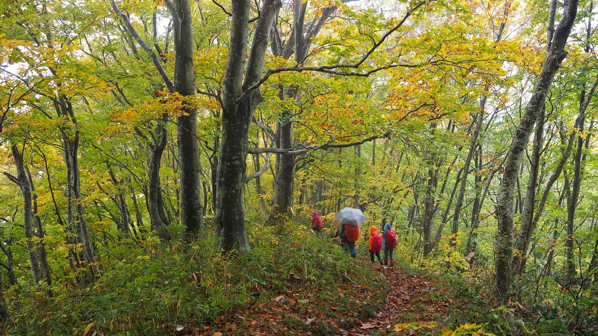 なだらかな尾根道では、雨で色鮮やかになった黄葉のブナ林が素敵。