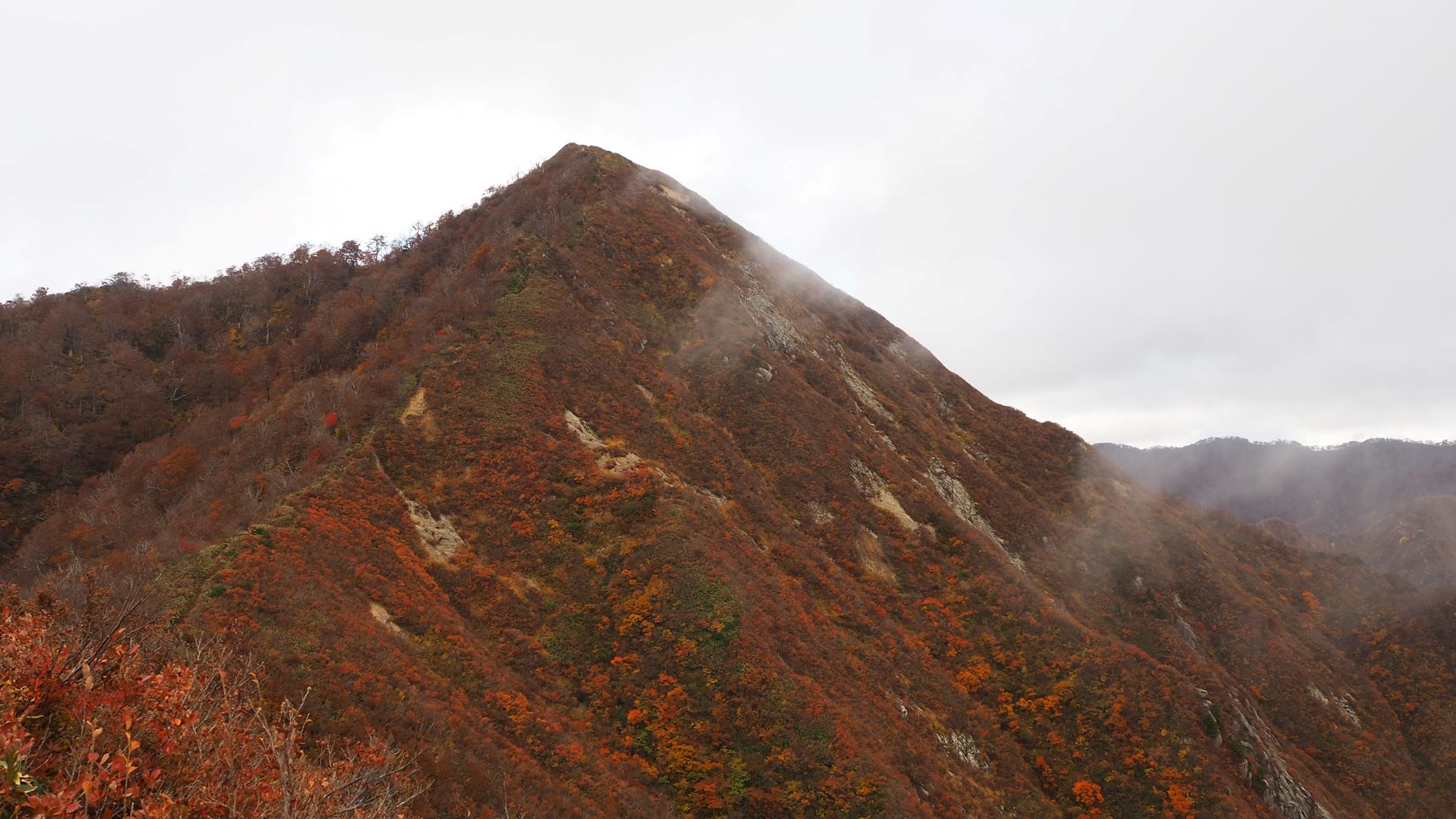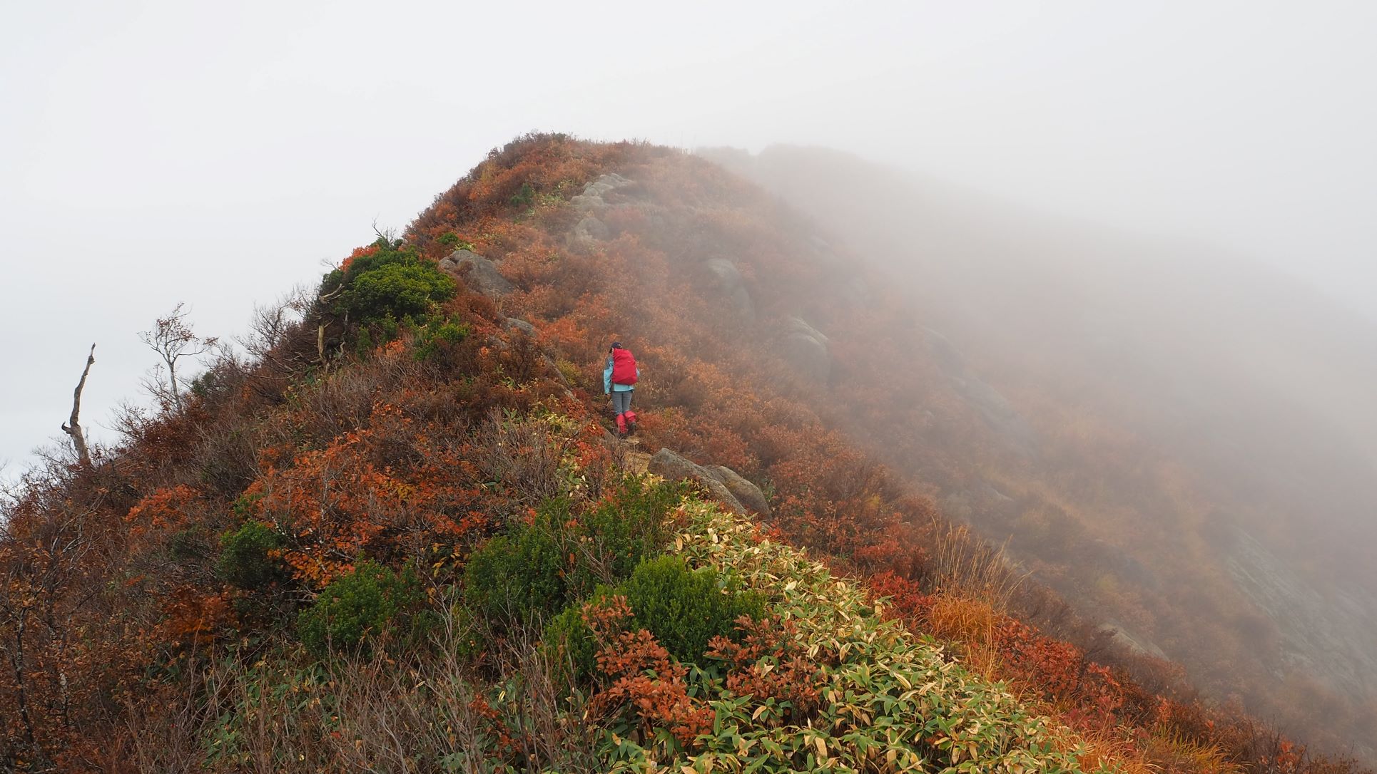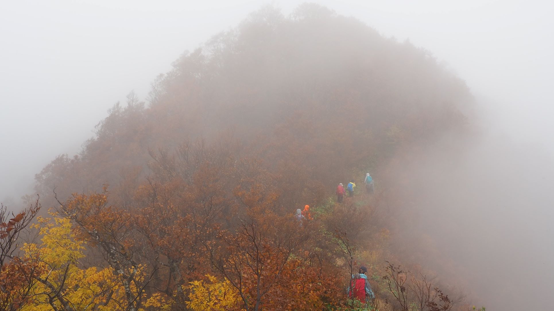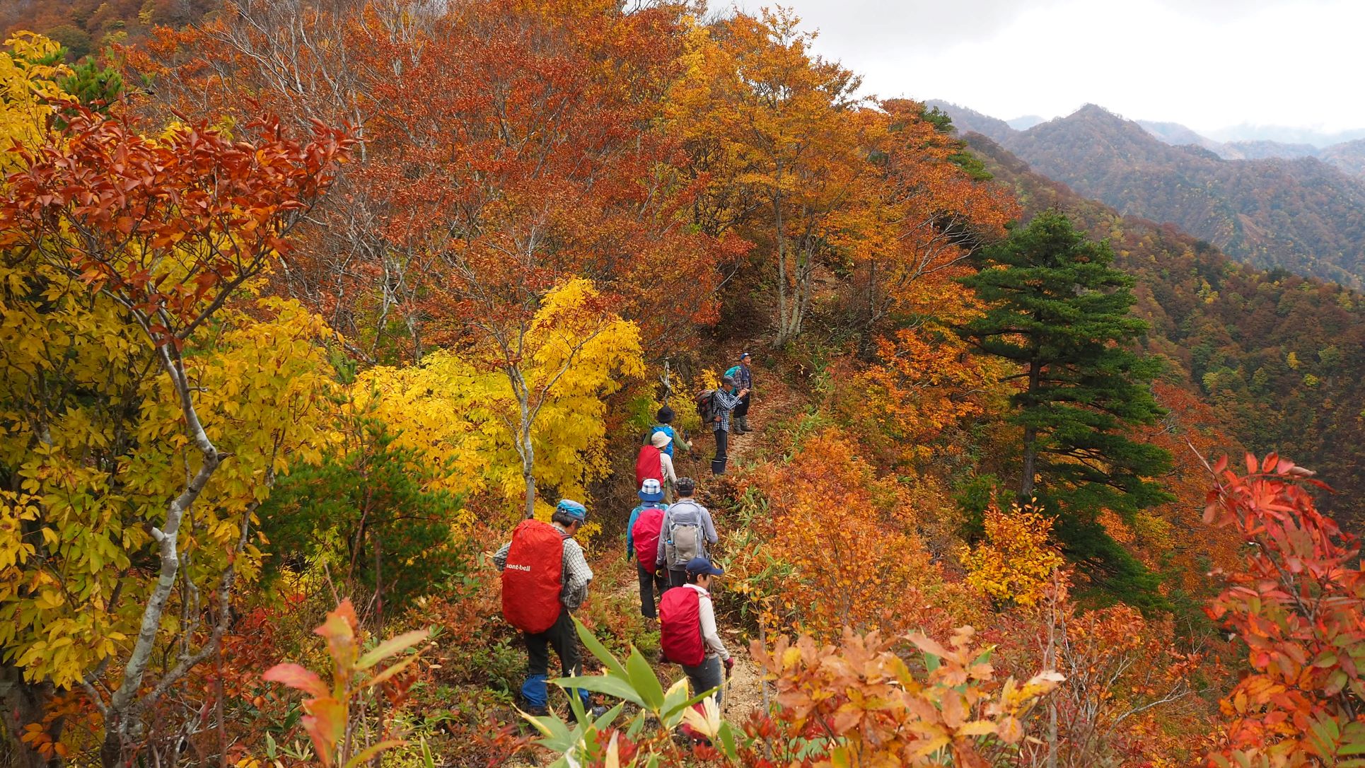急な下りで一息つけば、登ってきた尾根道が紅葉で良い眺め