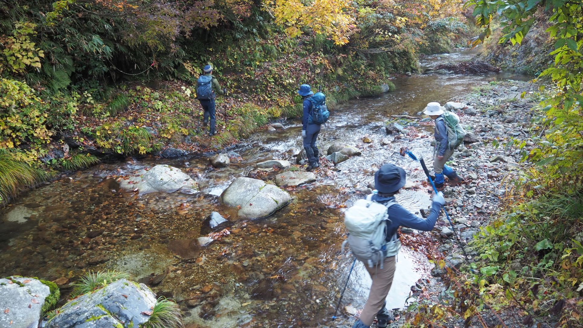 最初は沢沿いに下る。渡渉が3カ所。水量が多いと渡れない