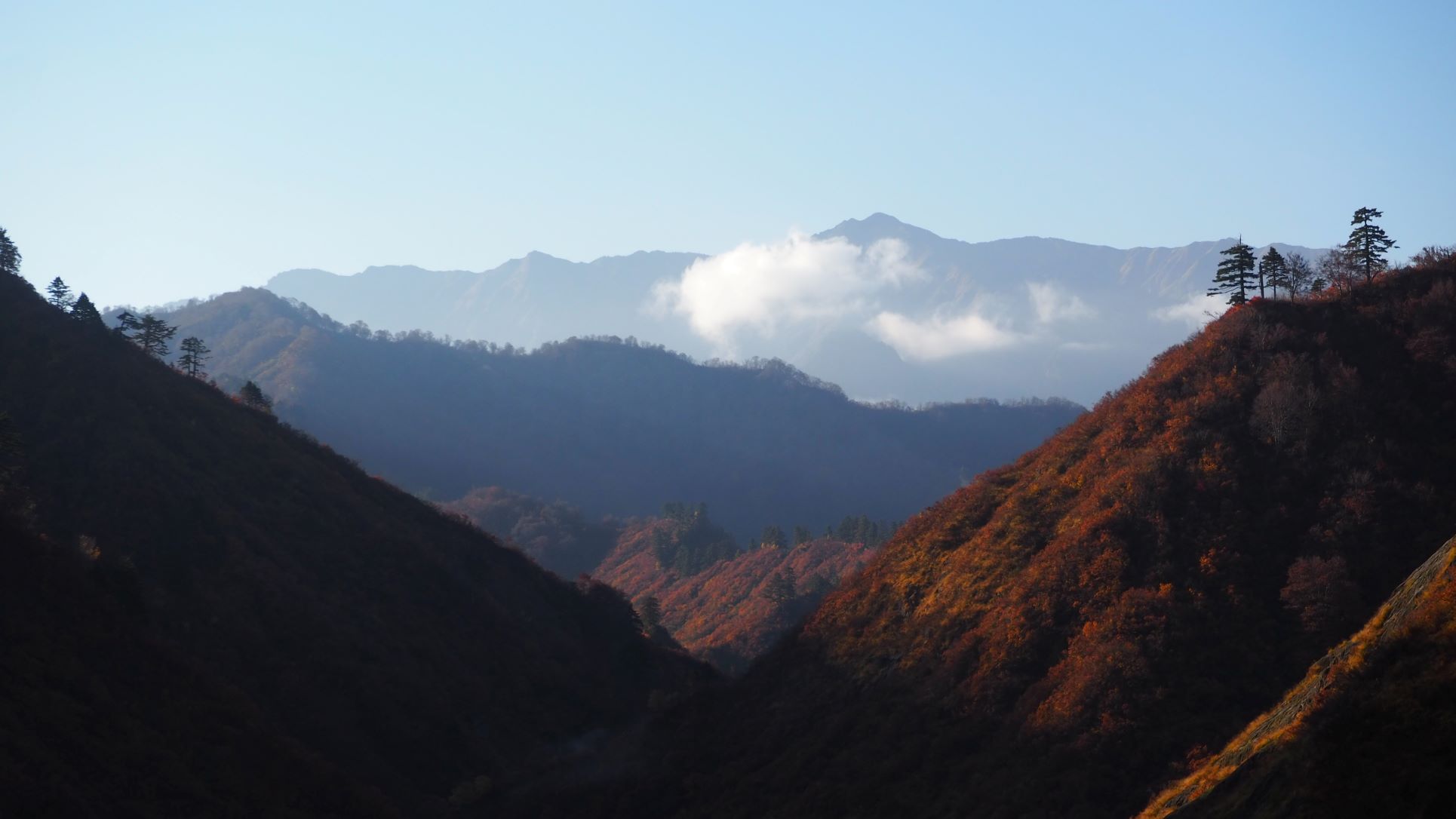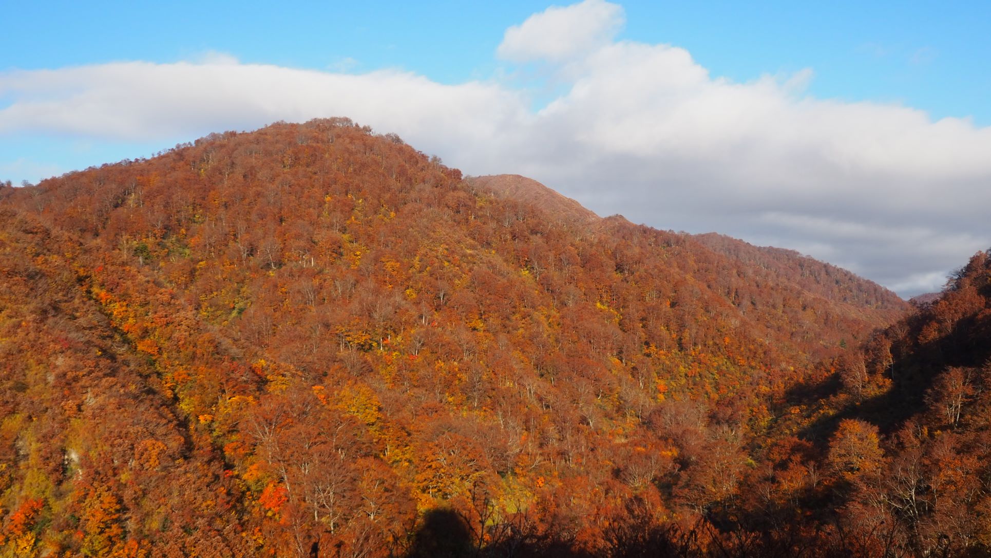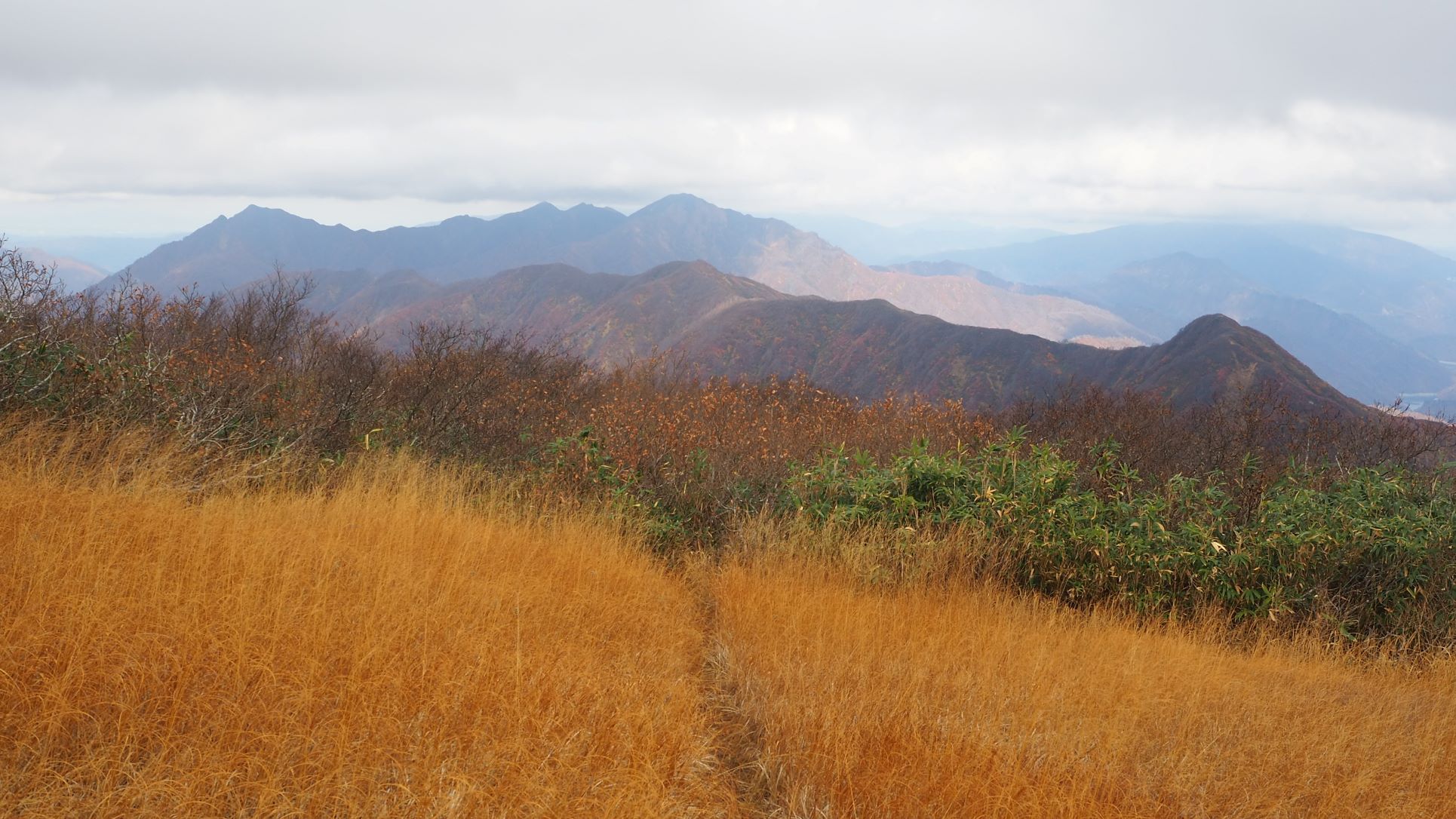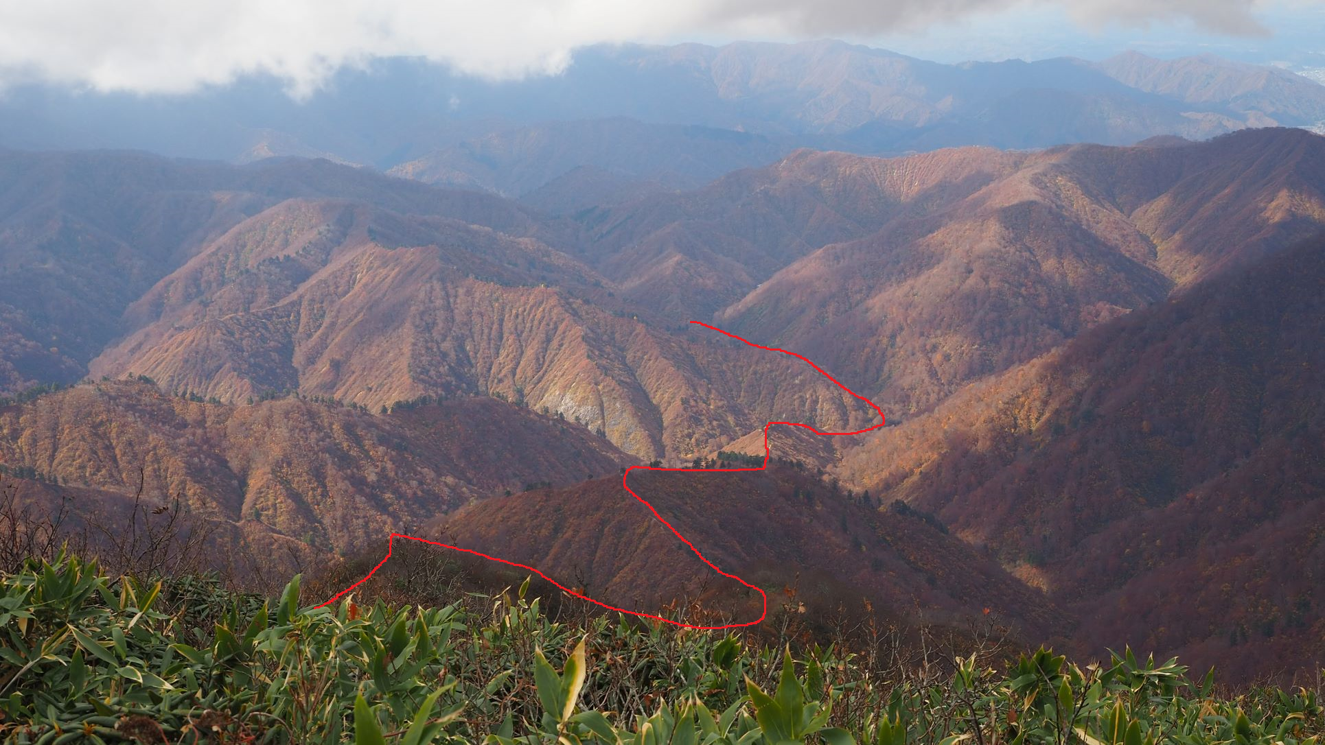 毛猛山塊とそれに続く稜線 浅草岳は雲の中