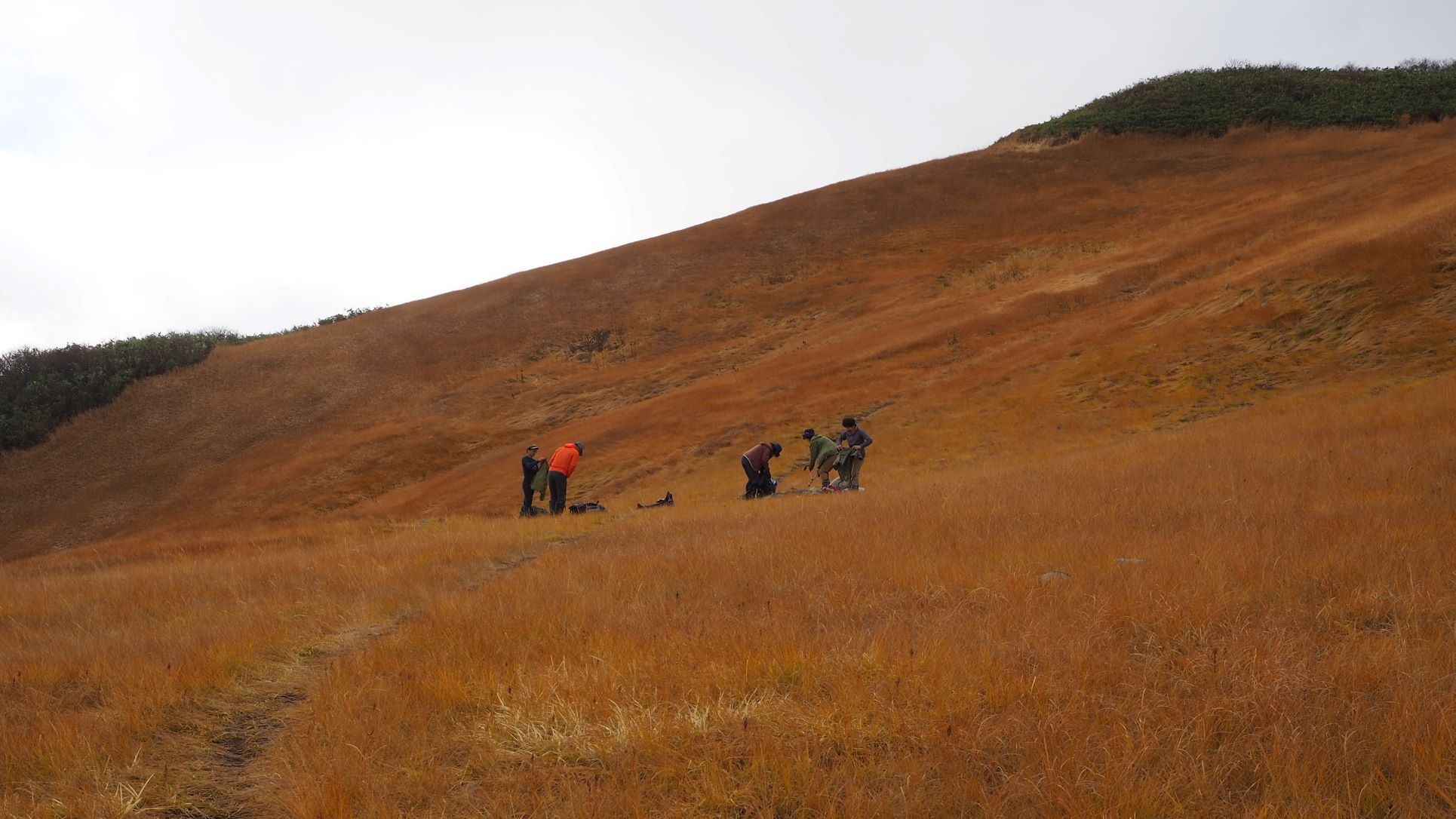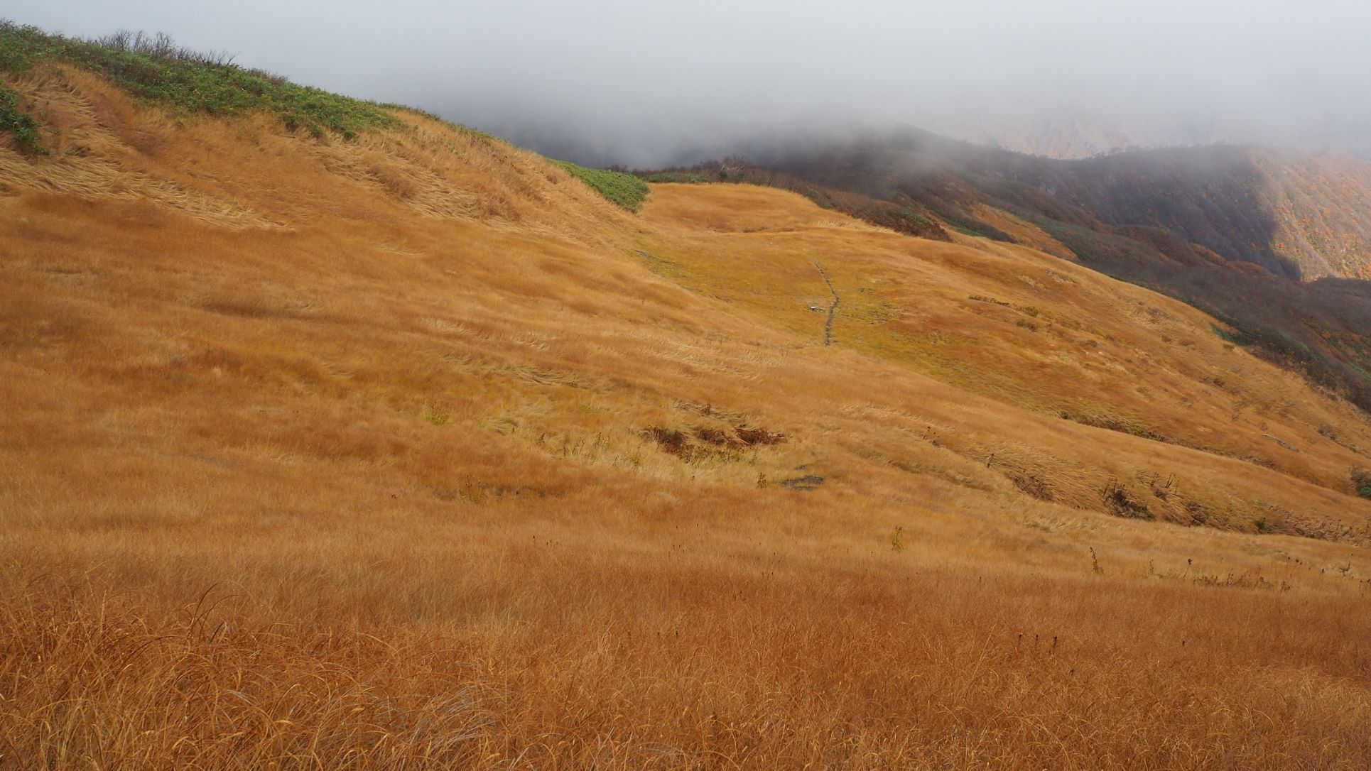 それでも前回の光兎山のように山頂ではガスもなくなり周囲の展望が開けた。山頂東側の草原に下りると風も弱く別天地のような風景に囲まれてお昼の大休止。