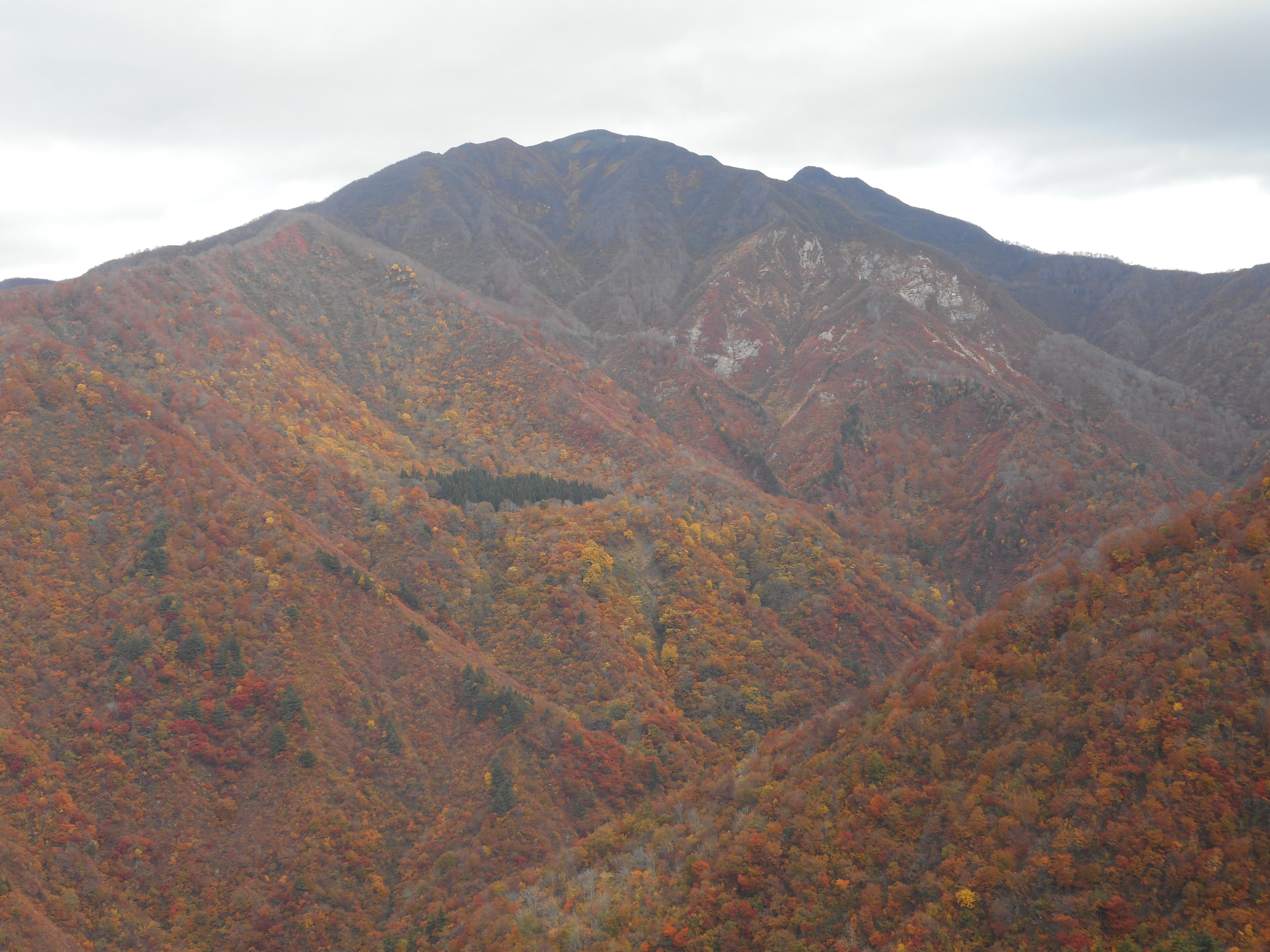粟ヶ岳の裏斜面は久しぶりである。紅葉は遅い位だが素晴らしい眺めである。ミシリ沢の頭から前白根までは直線の道でまた急登である。
