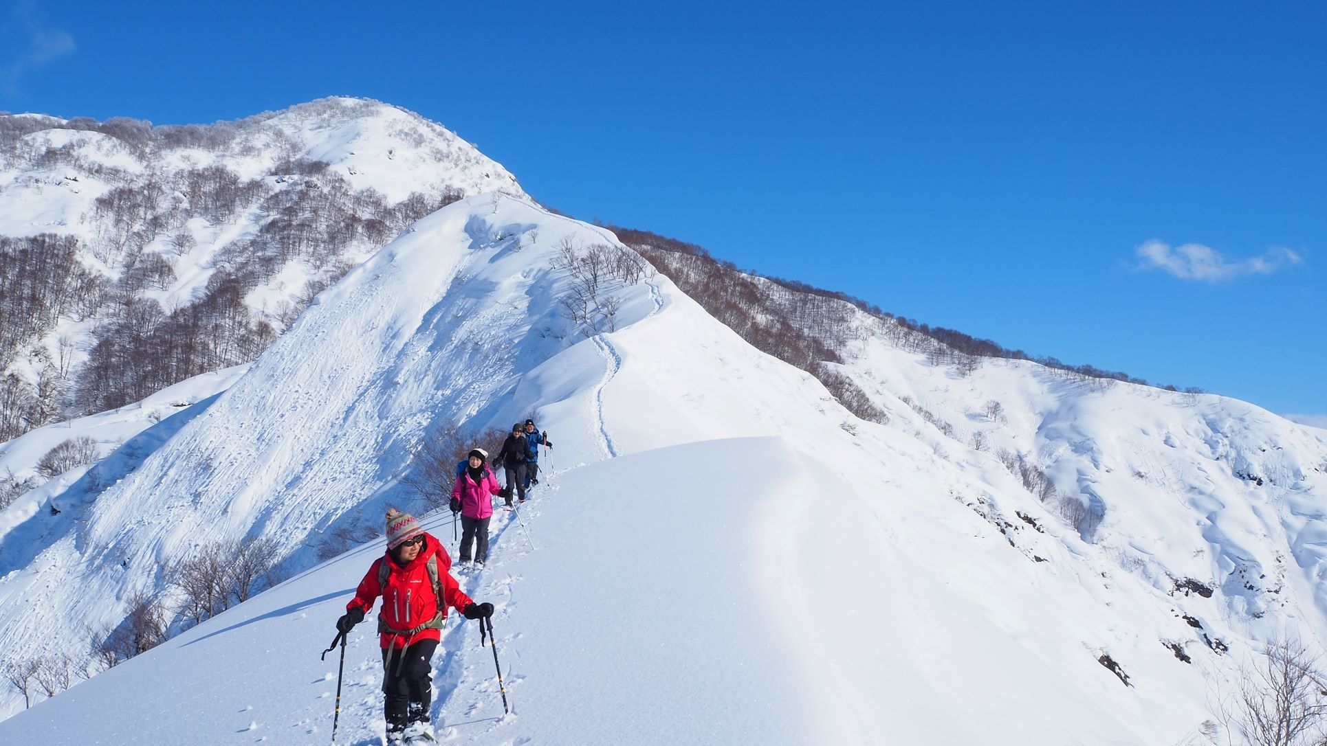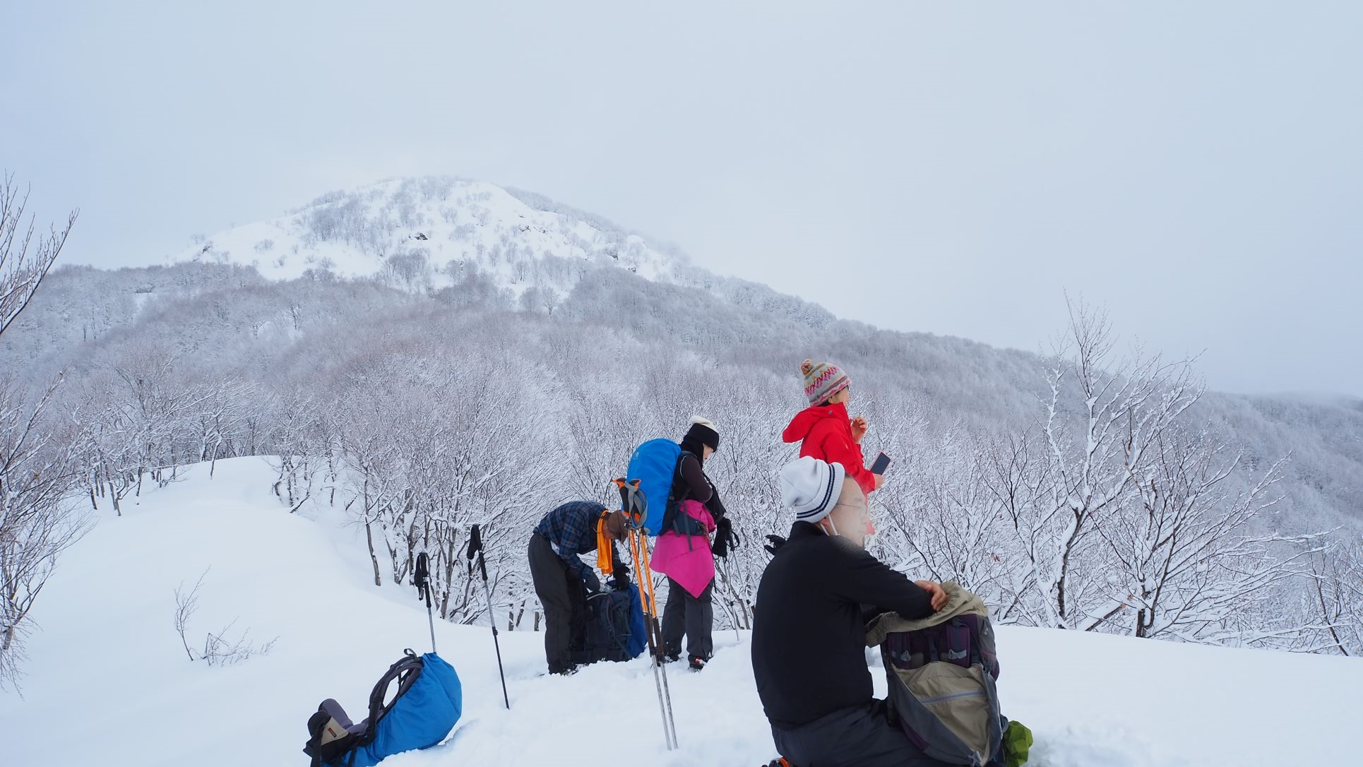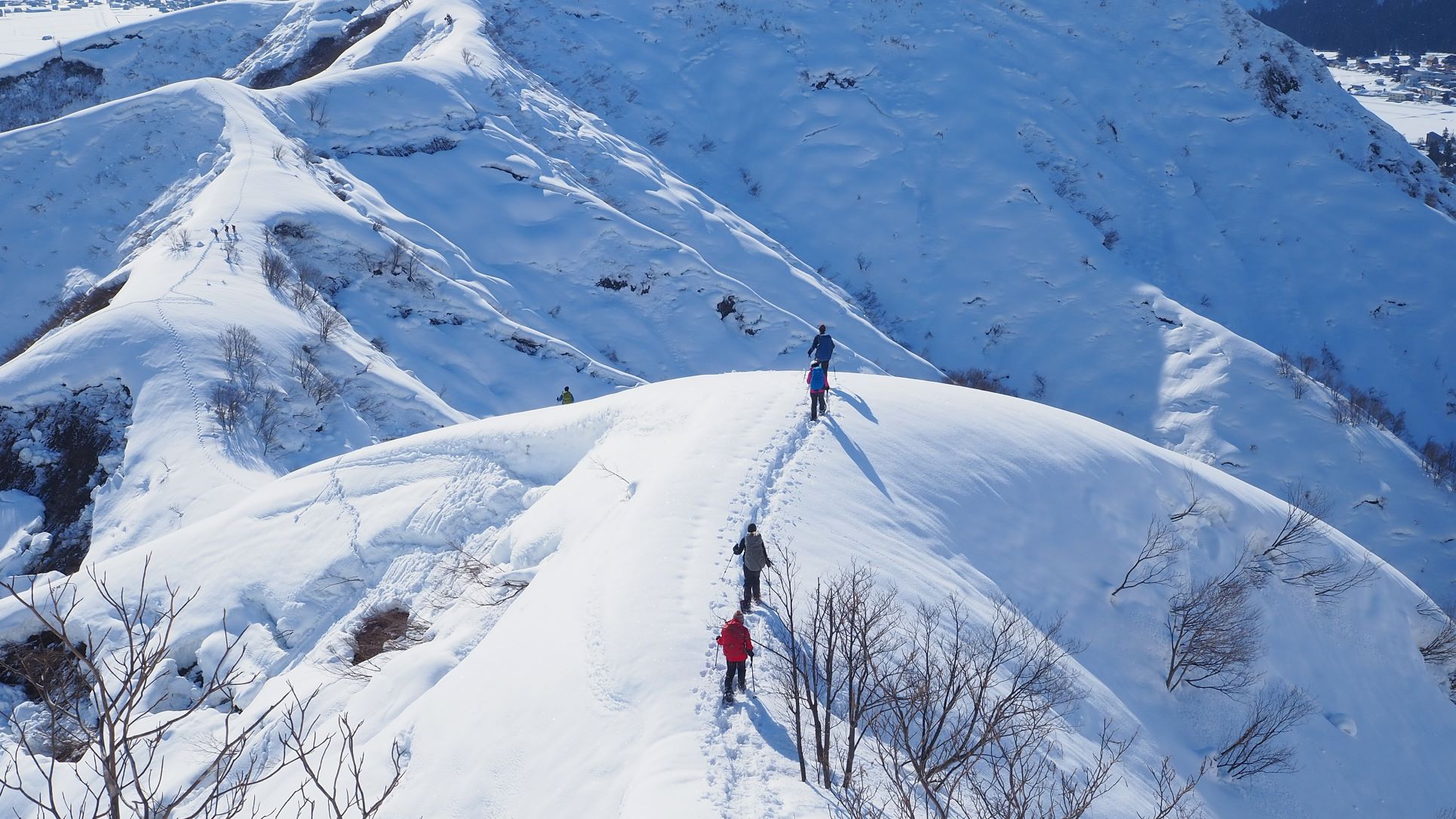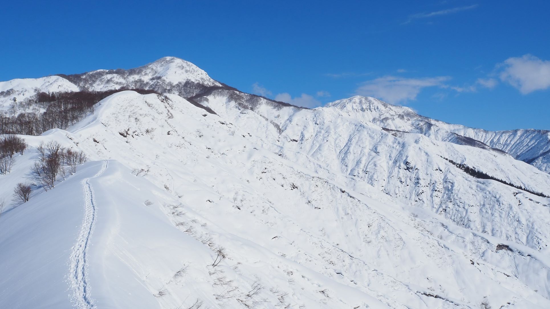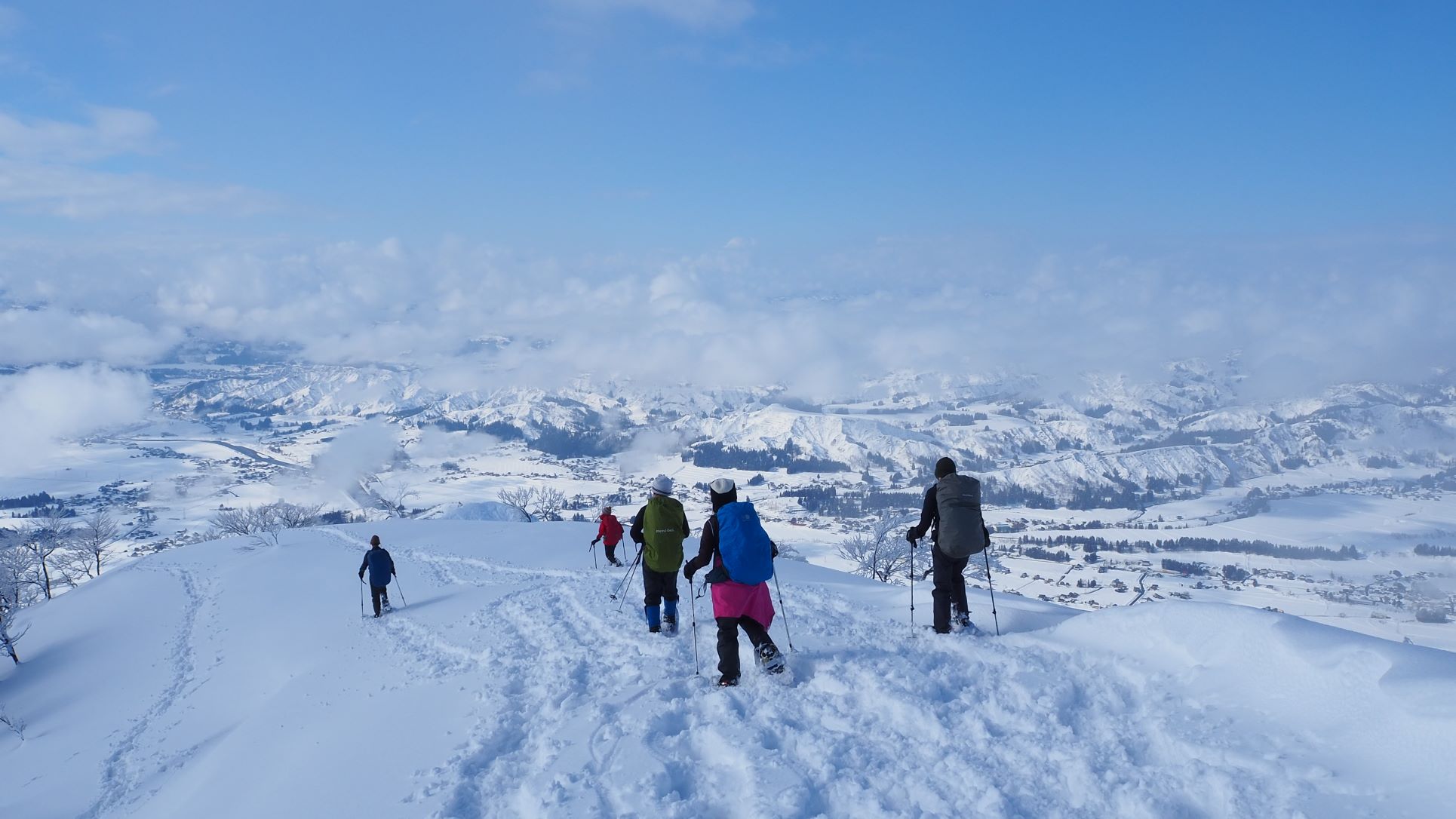 コースは山頂から南西に伸びる尾根を登り、西に伸びる長い尾根を下るという冬期限定の大展望周回ルート(全長7.5㎞)。ゴールに近づいたころに3名の猟師に出会ったほかは誰にも会うことなく悠峰貸し切りだった。