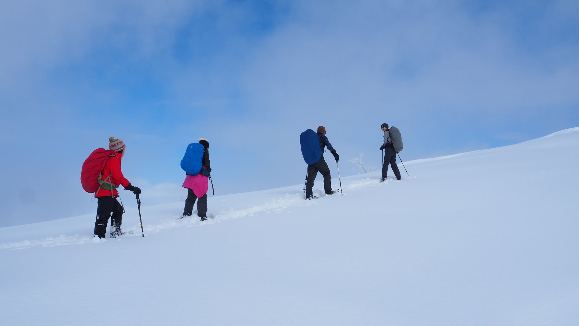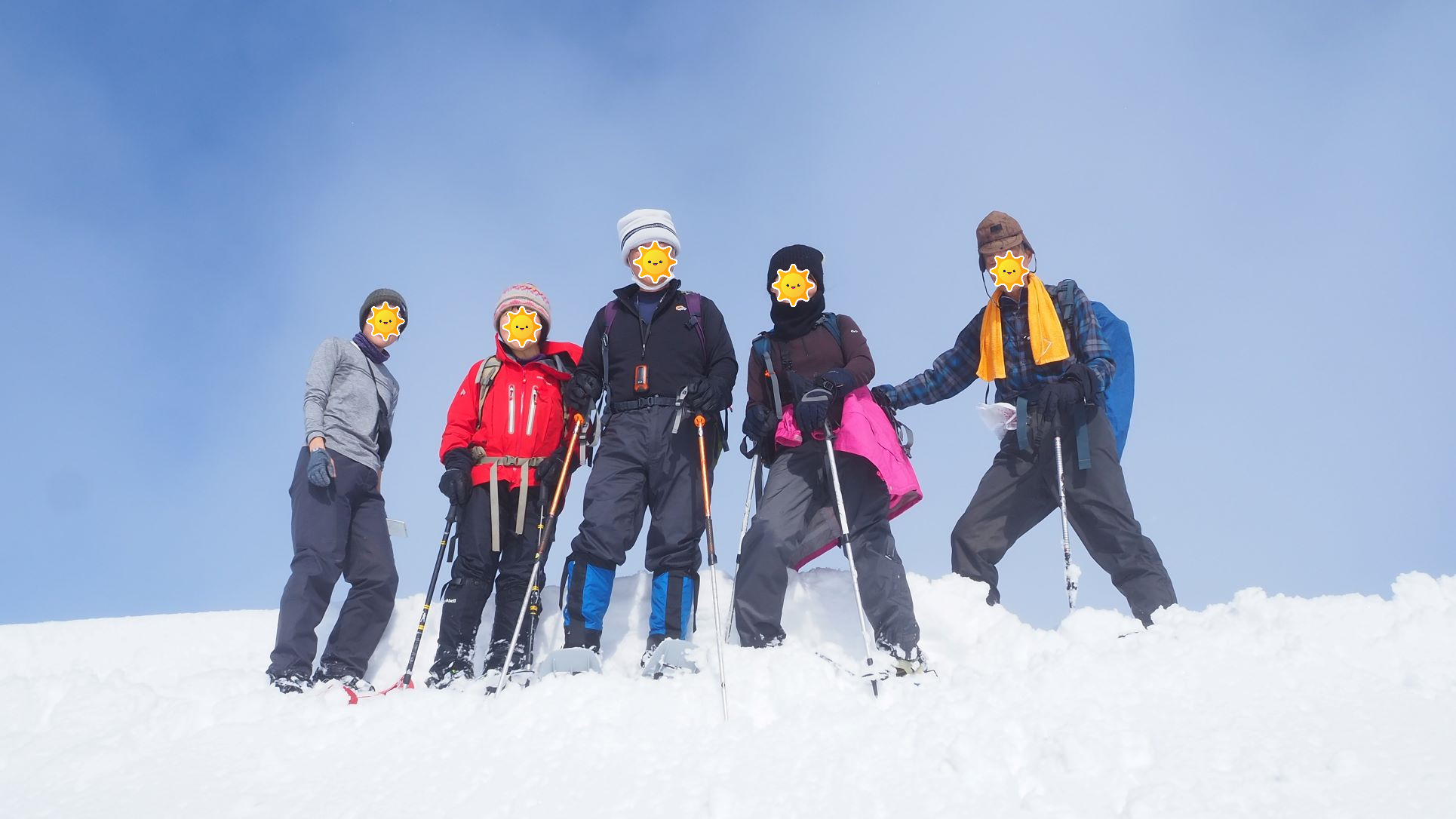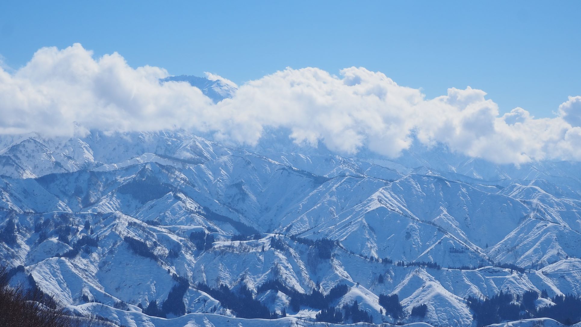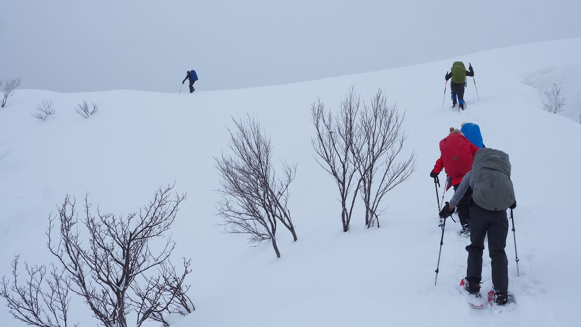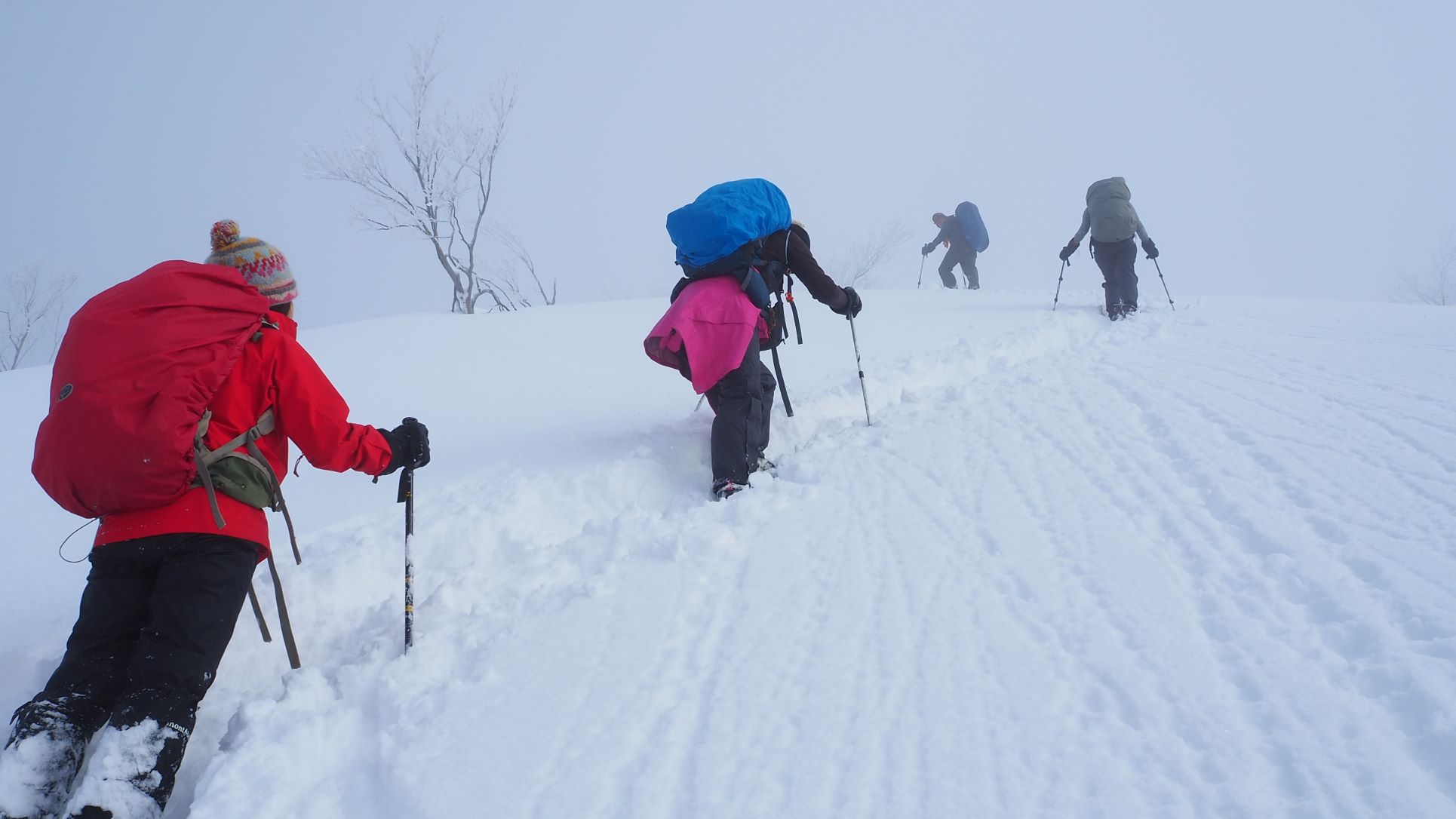 コースは山頂から南西に伸びる尾根を登り、西に伸びる長い尾根を下るという冬期限定の大展望周回ルート(全長7.5㎞)。ゴールに近づいたころに3名の猟師に出会ったほかは誰にも会うことなく悠峰貸し切りだった。