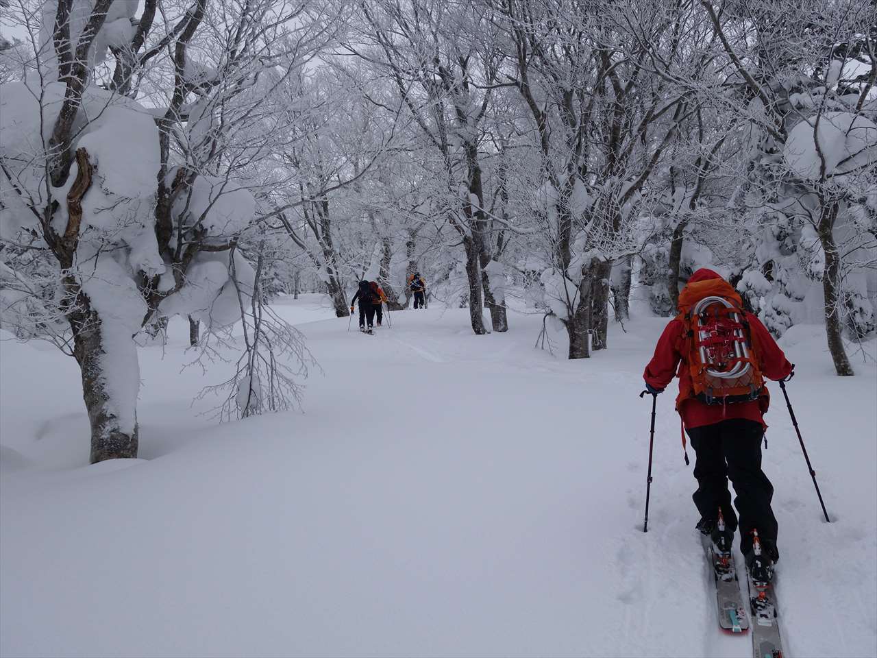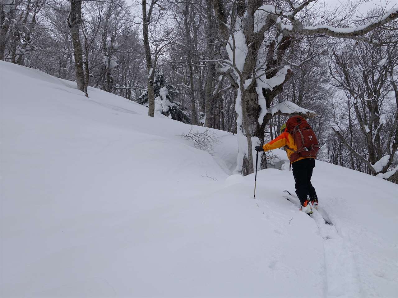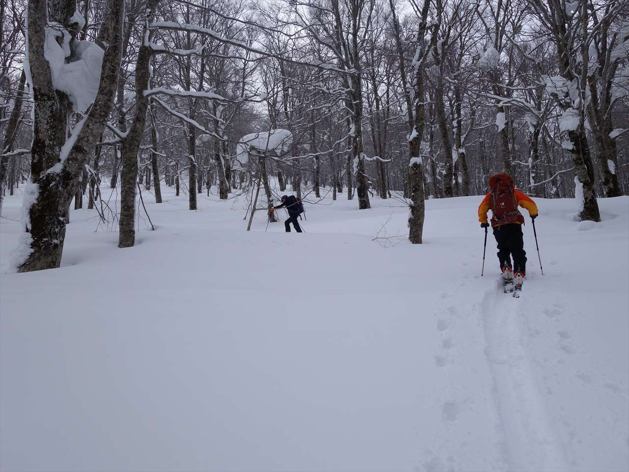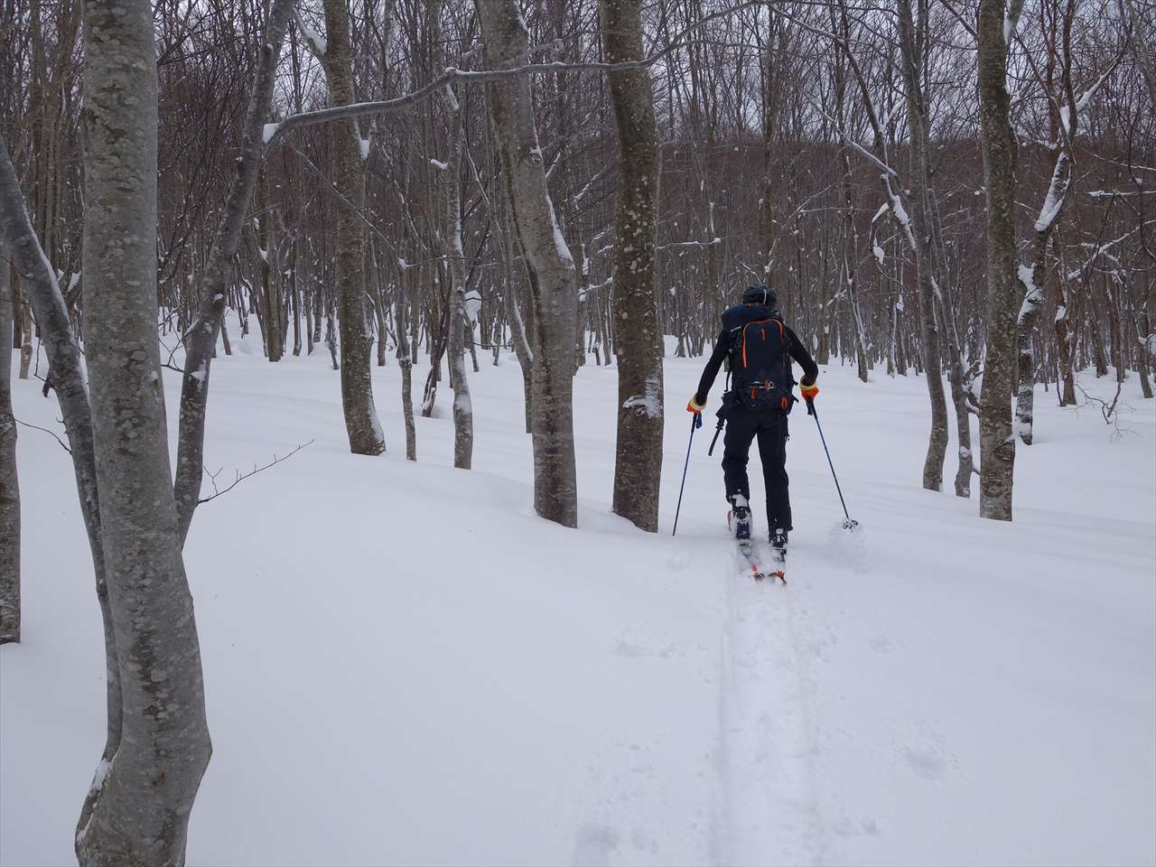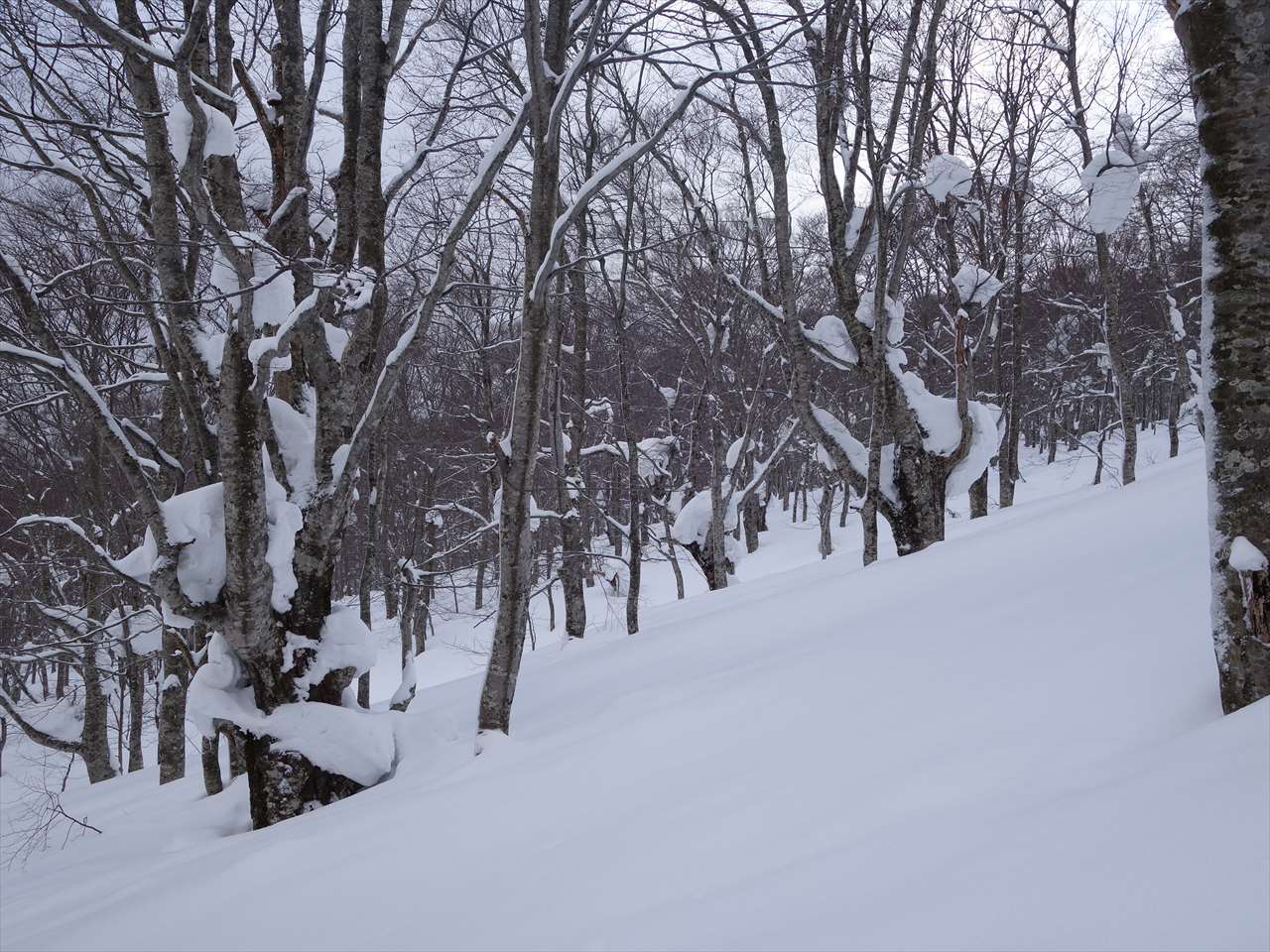 ブナの林間に溜まった優しい粉を巻き上げて滑る. たまりませ~ん!