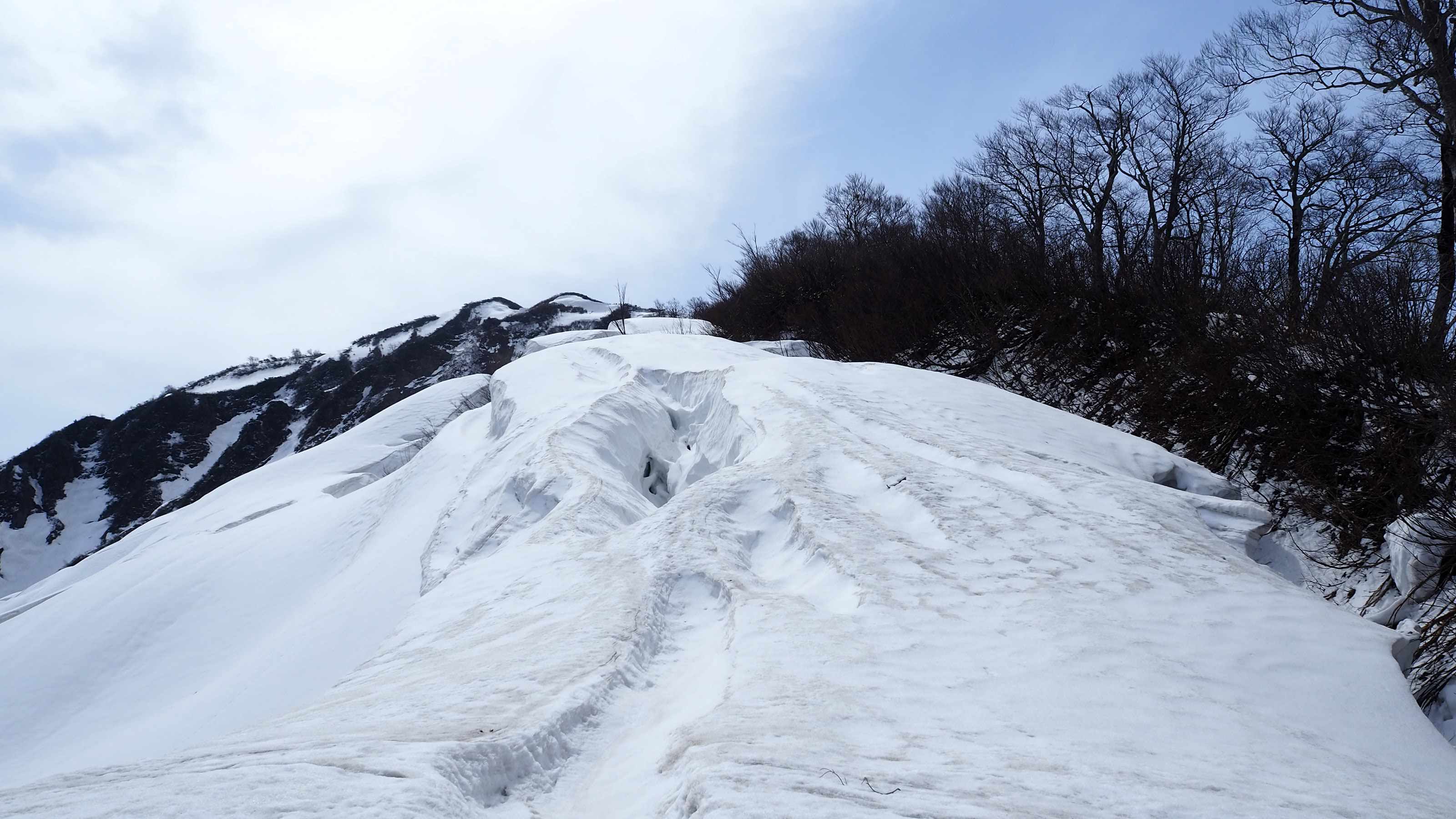雪割れを避けながら残雪の上を歩く。