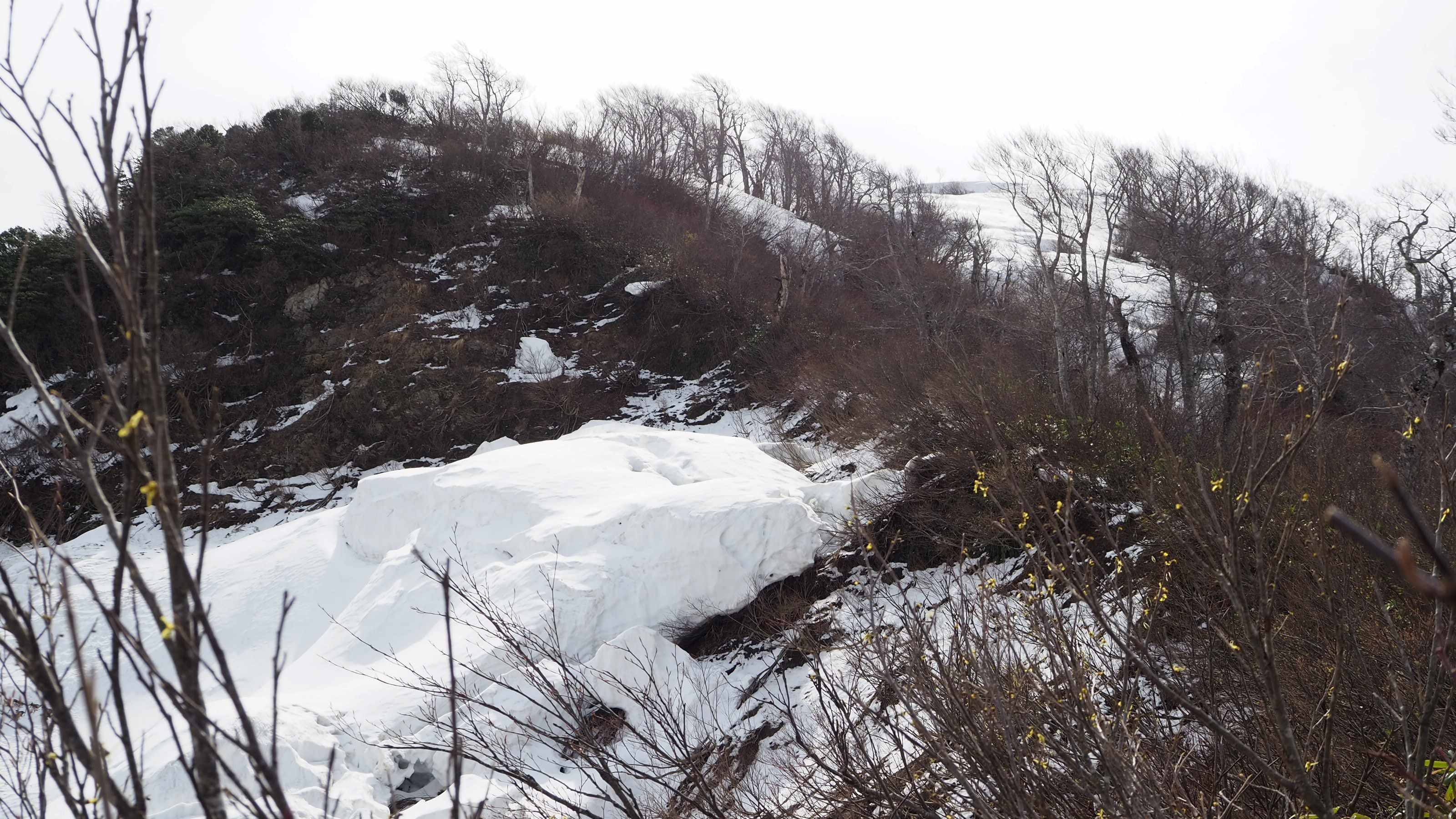 今回は再挑戦で出かけた。昨年より2週間も早かったのに例年になく雪消えが進みヤブこぎに苦戦したが、ようやく念願の登頂を果たせた。