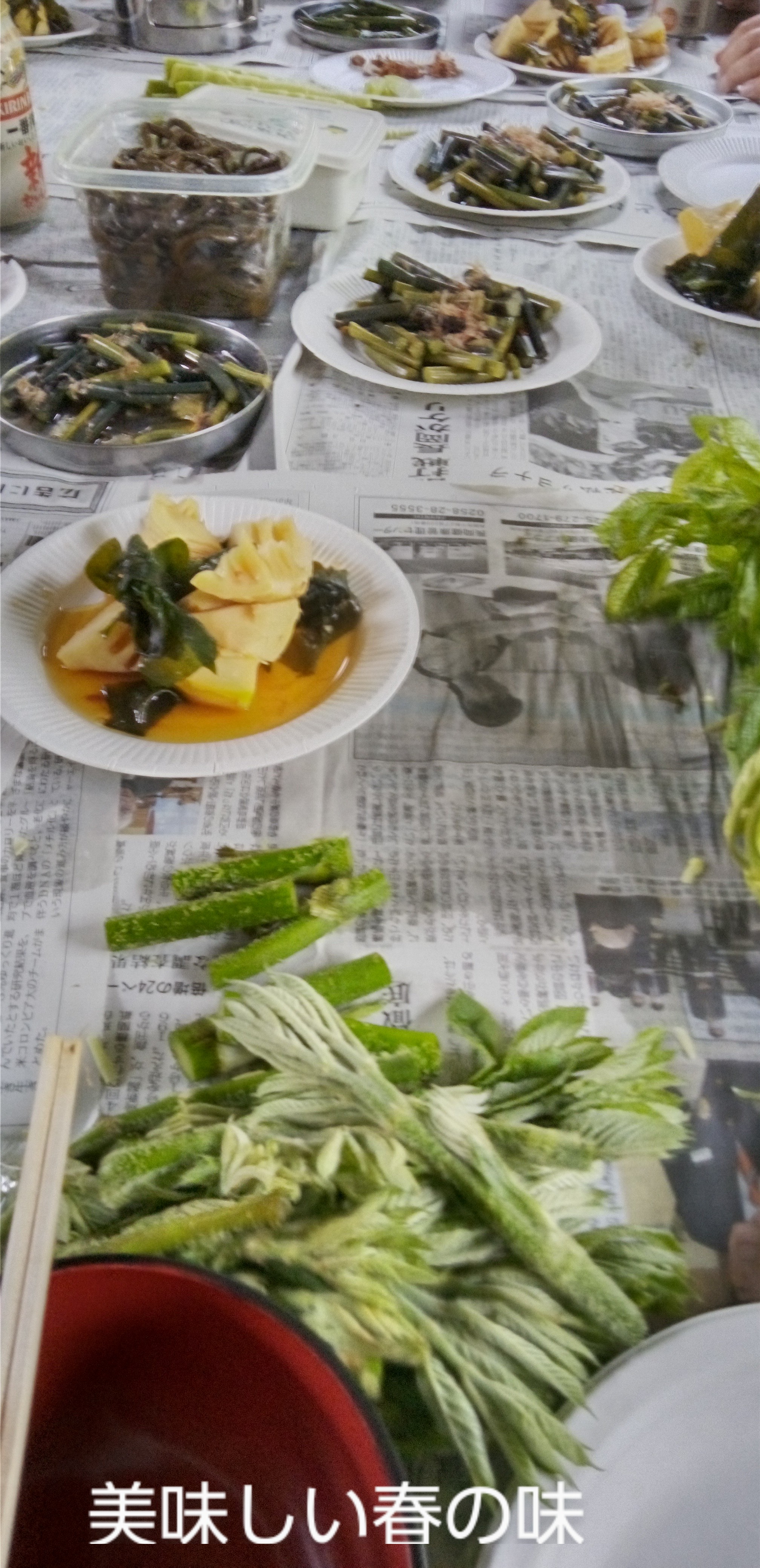 天気が悪い中での決行。 事前に山菜の収穫、会員より山菜の差し入れ等もありました。 会場も雨の凌げる所に変更し、14名の参加者でたのしみました。