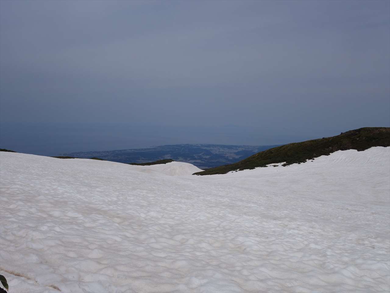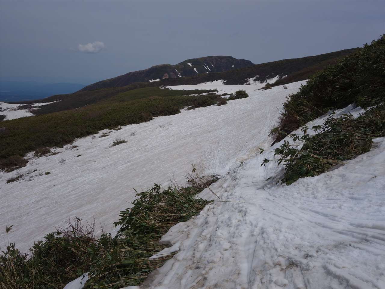 【夏道の長坂道で雪は切れている.】