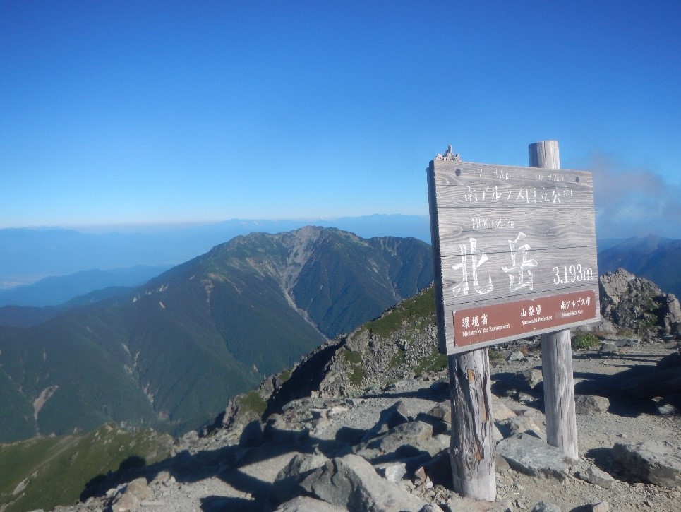 翌日は暗いうちから歩き出す。まずは北岳まで1000メートルの登りで、すぐに草スベリの急登となる。小太郎尾根にのると、傾斜も緩やかになり、北岳も大きく近づいてきた。肩の小屋からまた急登となり、登り切ると北岳山頂だ。山頂からは素晴らしい展望が広がっている。目の前には仙丈岳が大きくそびえ立っていた。山頂から延びる長大な尾根が仙塩尾根だ。