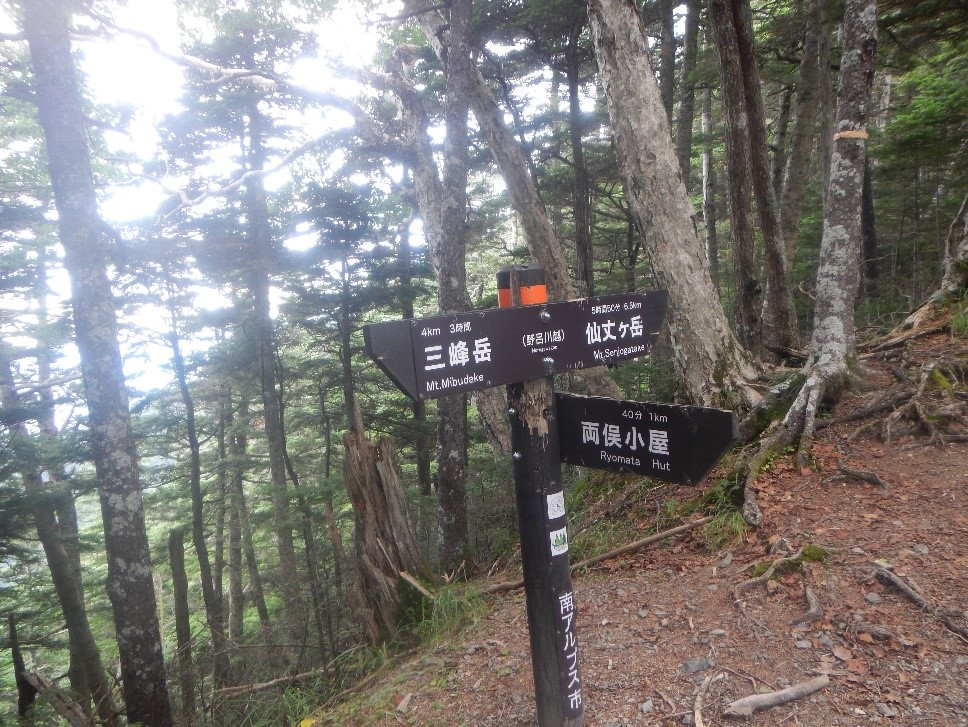 登山道は北岳山荘まで300メートル下り、間ノ岳までまた300メートル登る。間ノ岳までは登山者でにぎわう稜線漫歩だ。間ノ岳を越え、三峰山頂手前から仙塩尾根に入る。最初はザレ場の急斜面だが、すぐに針葉樹林帯に入った。野呂川越まで緩やかなアップダウンの道が続く。展望は利かないが、歩きやすく快適な尾根道。野呂川越で尾根から外れ、300メートルほど下ると両俣小屋だった。