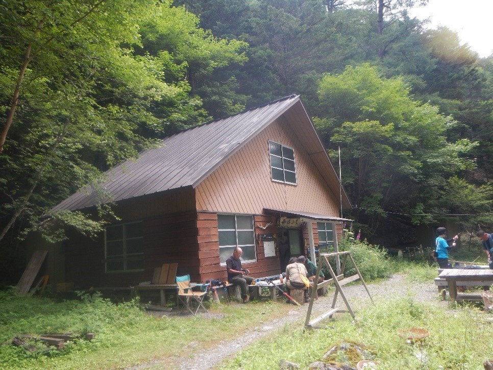 <両俣小屋。野呂川沿いに建つかわいらしい小屋>