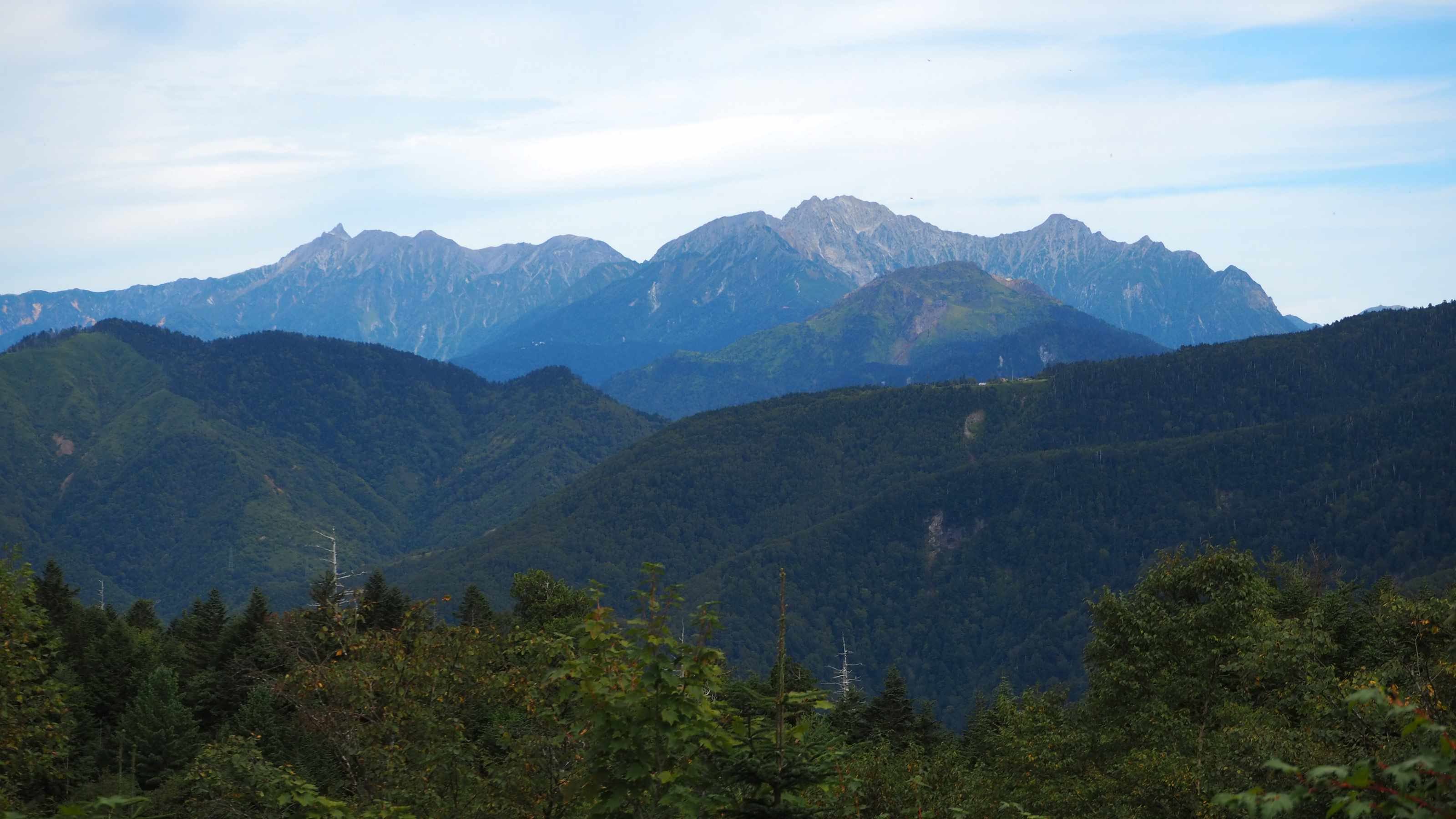 丸黒山山頂から槍穂の峰々。乗鞍岳も近く見える。