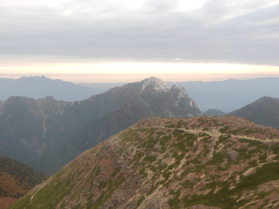仙丈ヶ岳直下から地蔵尾根に入る。黒戸尾根は急で険しい尾根だったが、地蔵尾根は緩やかで長い尾根といった感じだろうか。