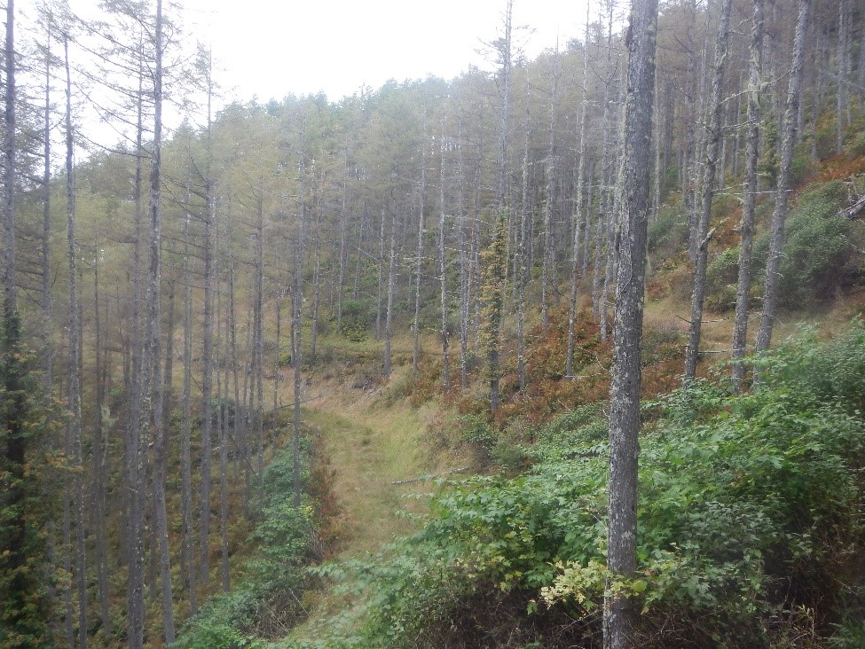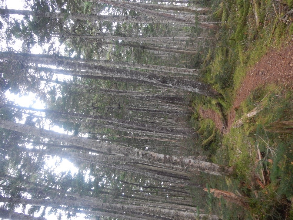 <地蔵尾根。針葉樹林の中、上部は苔むした森で、下部はシダが茂る森>