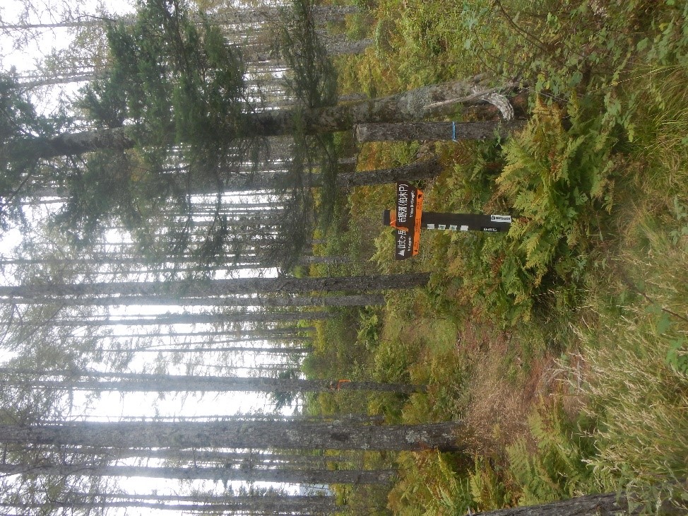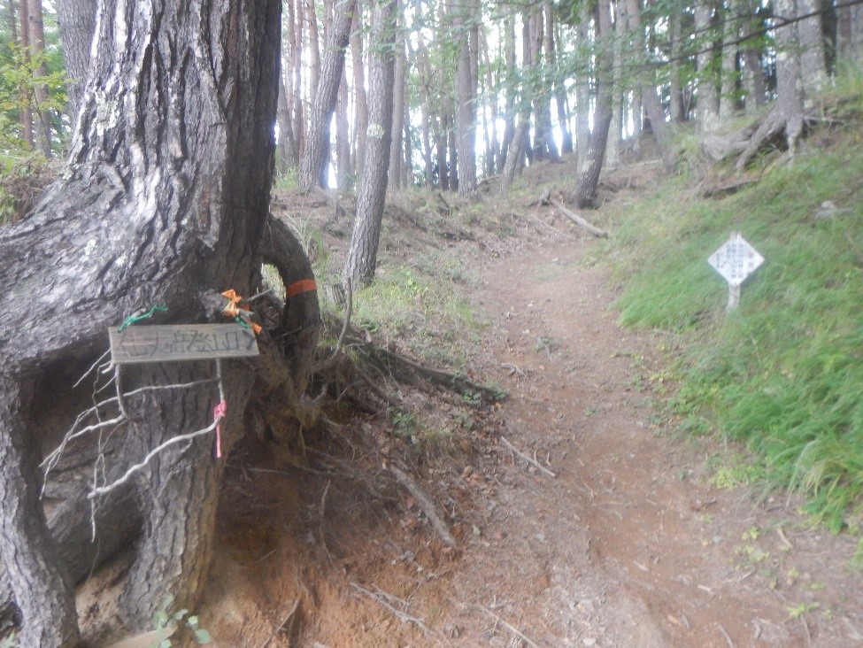 最初はややヤセ尾根のガレ場だったが、樹林帯に入ると歩きやすい道となった。登山地図では破線になっているが、随所に道標があり、道も明瞭だ。針葉樹の明るい森の中、アップダウンを繰り返しながら、少しずつ高度を下げていく。