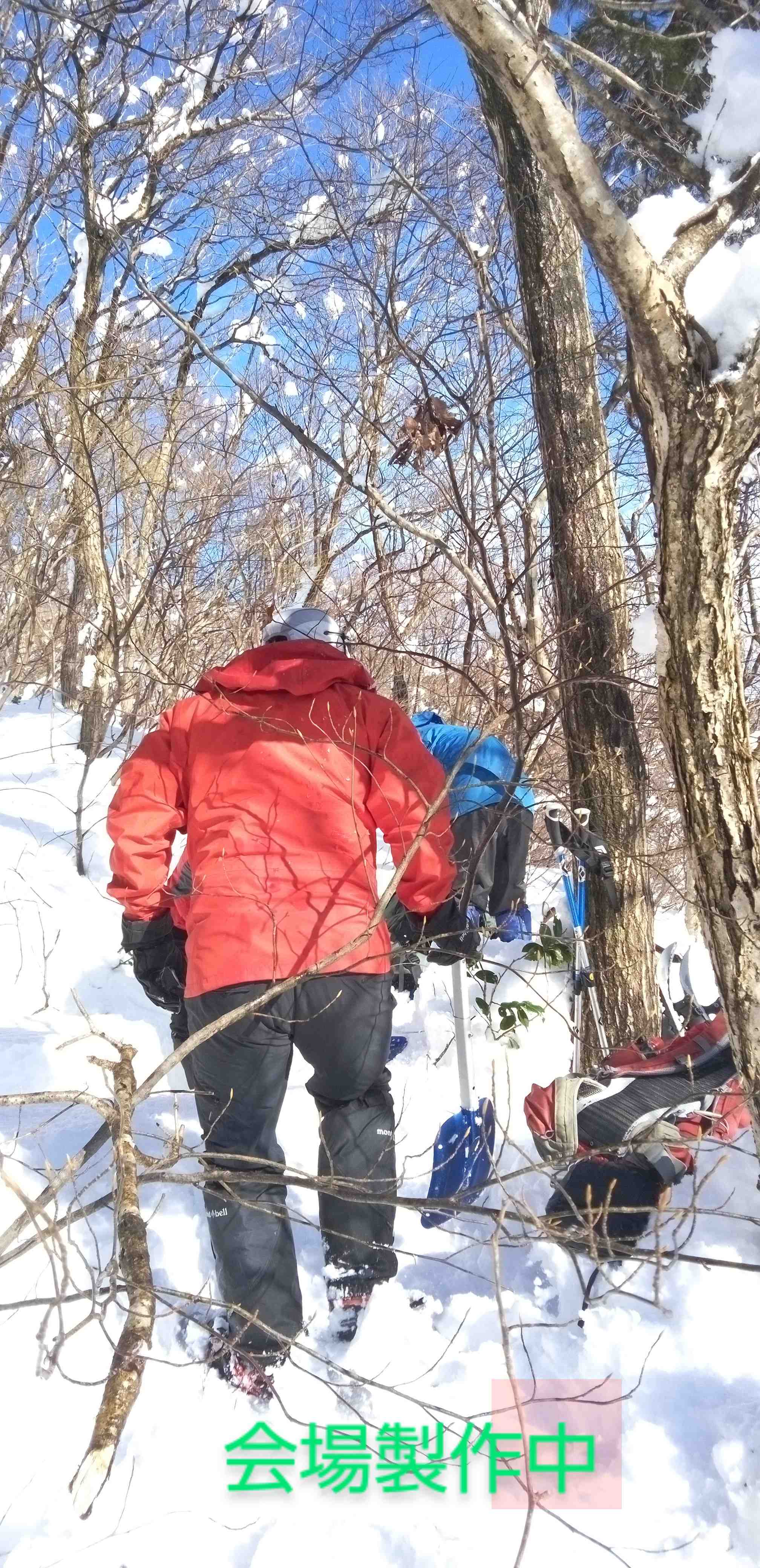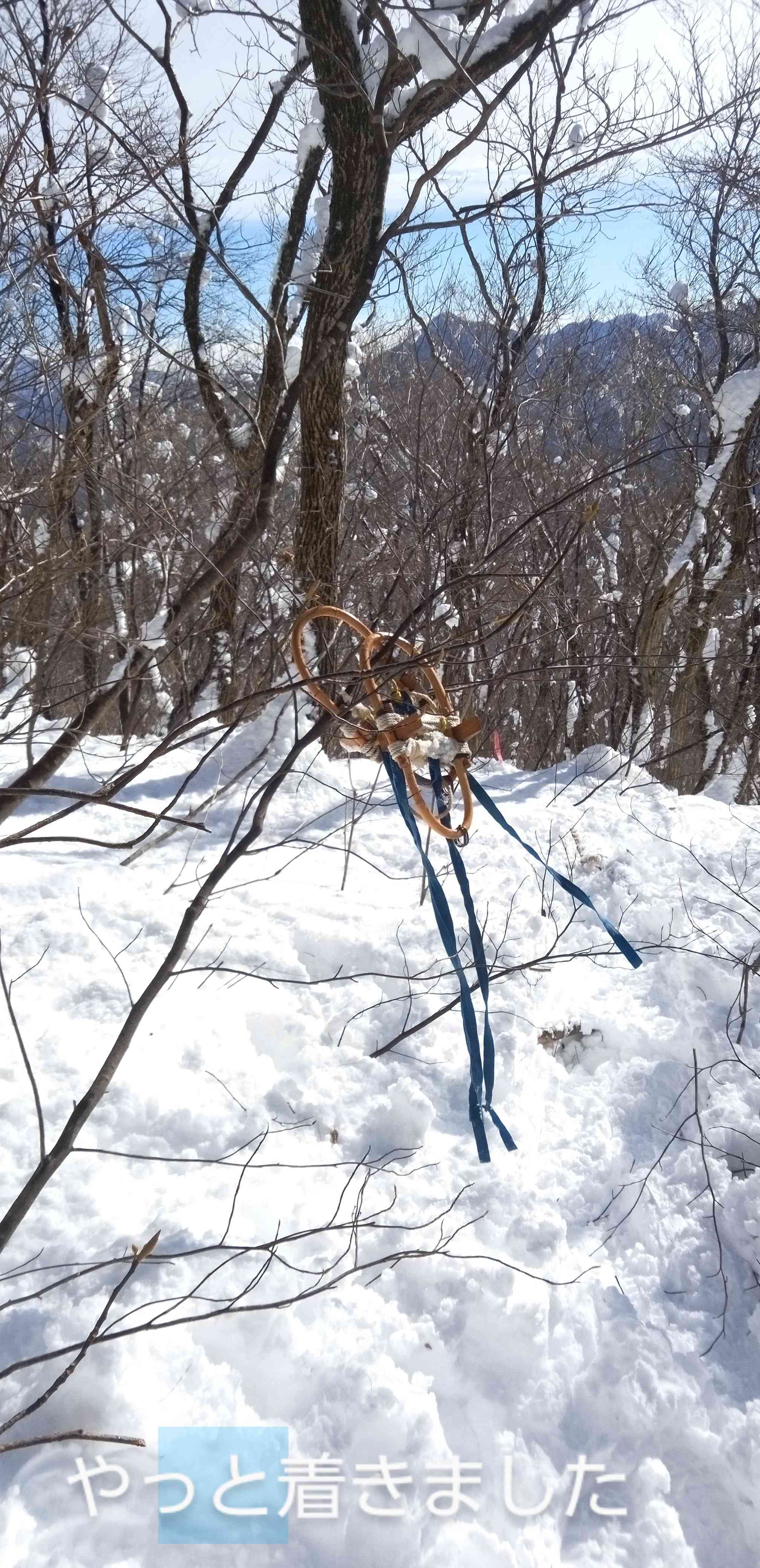 今回のースは、駐車場から少し戻った辺りから尾根に取付く初めてのところを歩きました。歩き始めて、スノーシューに不具合があったり、コースを間違えたりして目的のコースを歩くことがきませんでした。