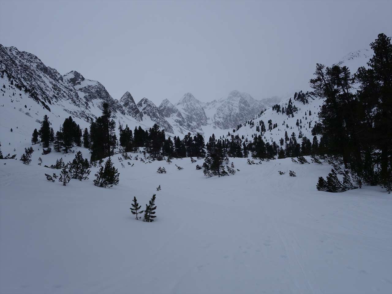 当初は駐車場所から良く見えるシャフツーレンの山頂に登ろうと計画していたが,雪の状態から緩いところでロスボーデンの谷を目指す.