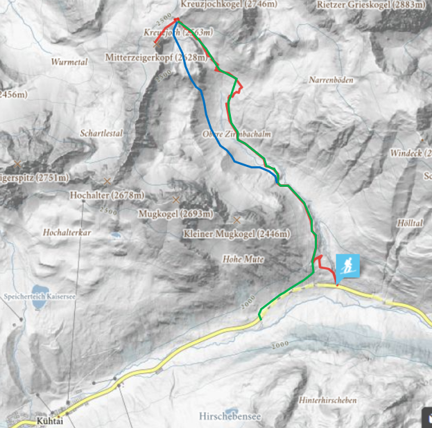 昨日のエージェントMを交えた秘密会議で雪が確実にあるキュウタイスキー場手前のクロイツヨッホに突撃と決まった.