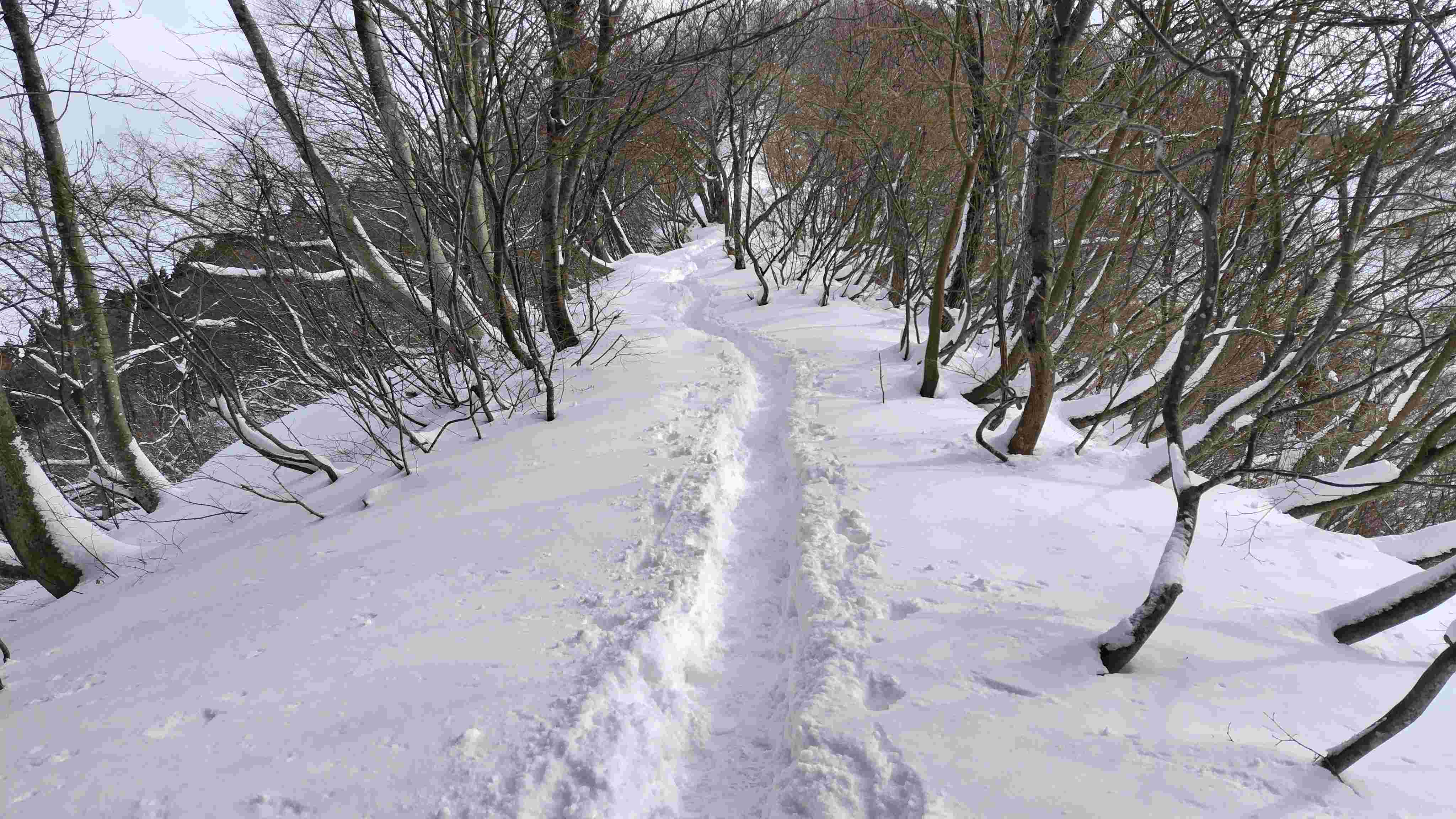 観鋸台から先に行く人は少ない。この日はワカンの跡がありそのトレースをたどる。しばらくするとトレースの主2人が戻ってきたのでラッセルの礼を言うと、この先で引き返してきたと言う。その言葉通りまもなく栖吉への分岐でトレースはなくなっていた。