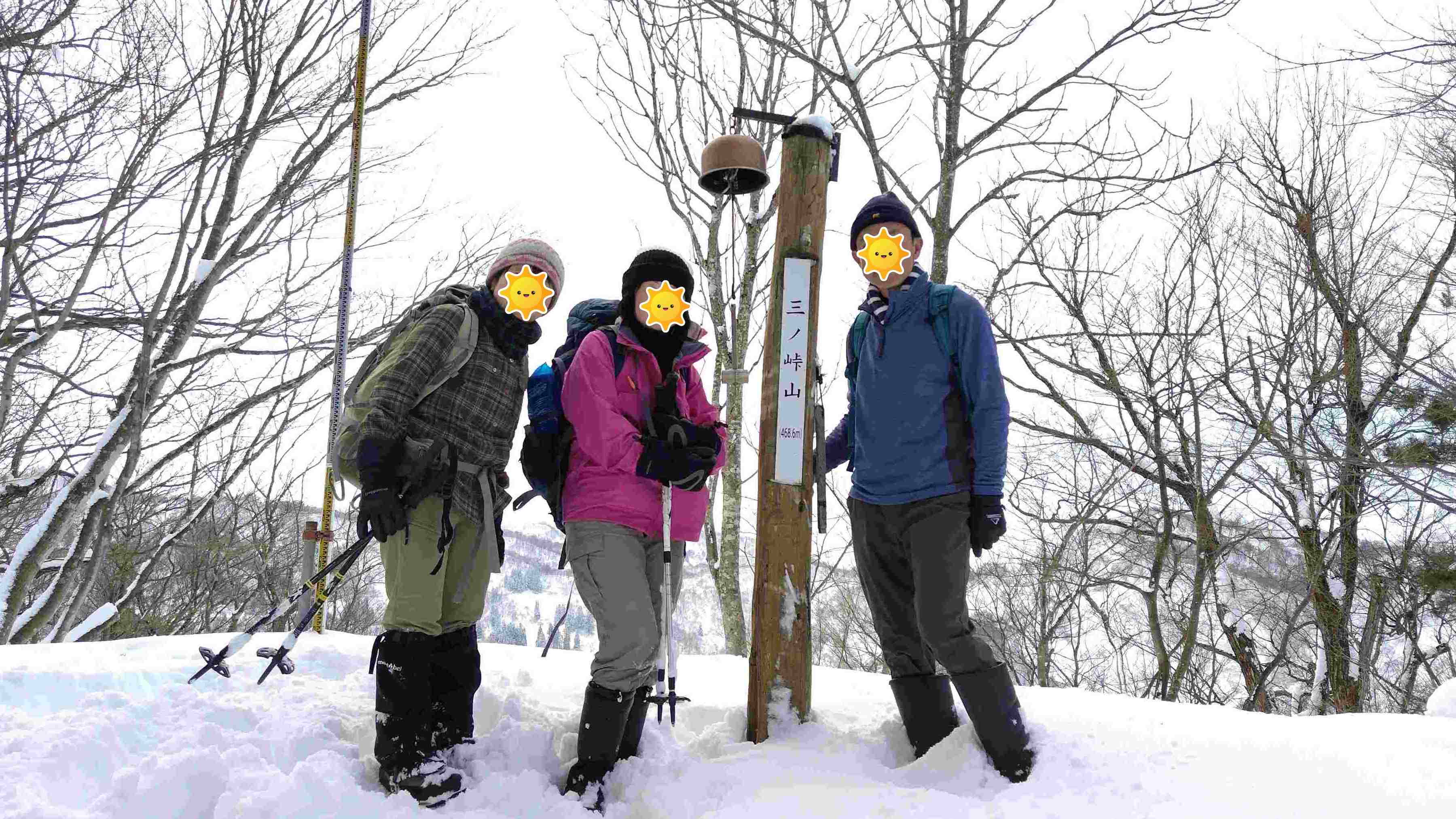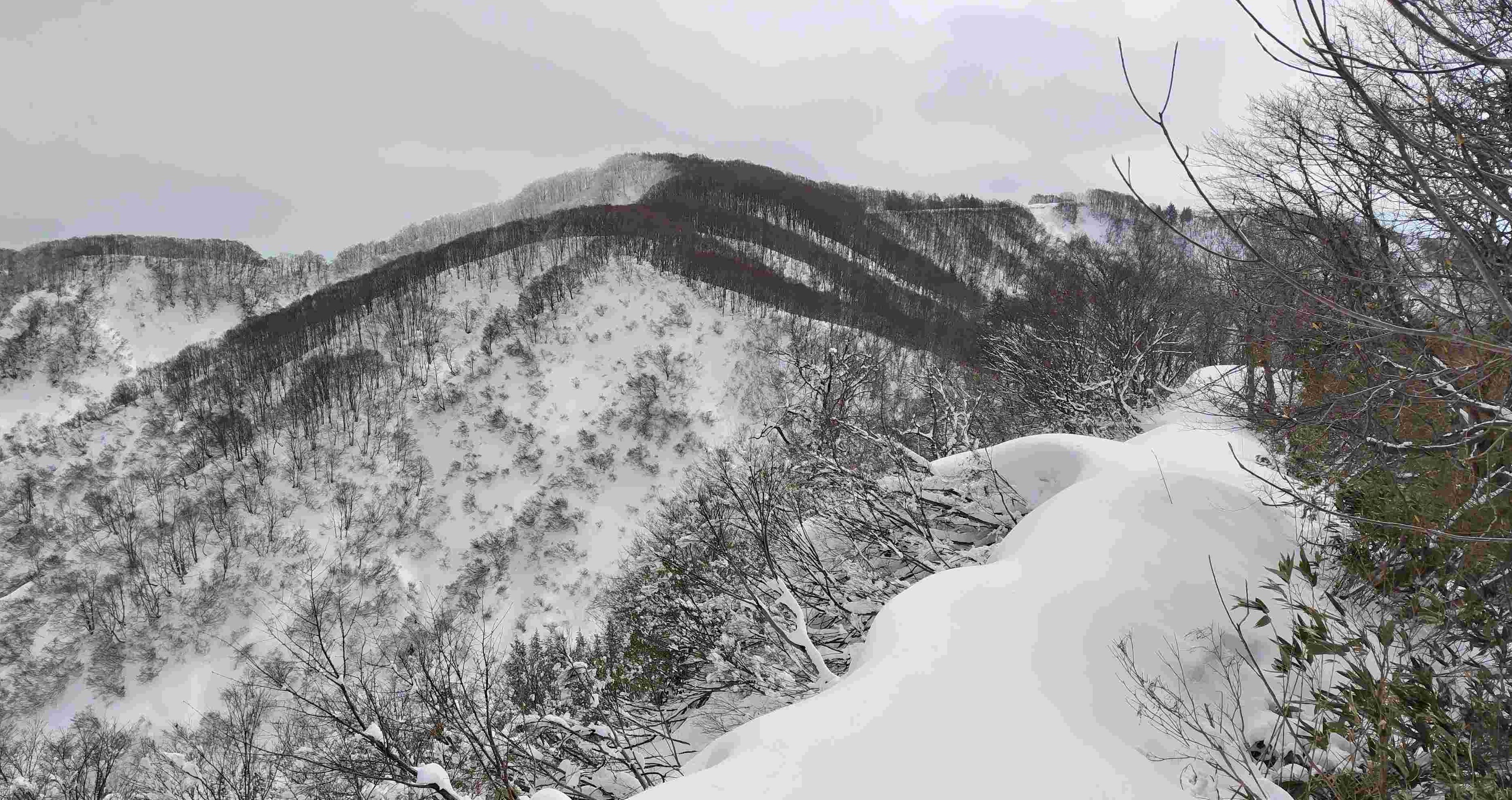 三ノ峠山山頂までは順調に到着。道もよく整備されているので気になるようなヤブもない。昨日からの新雪が約30㎝。古い雪はほとんどないようだった。