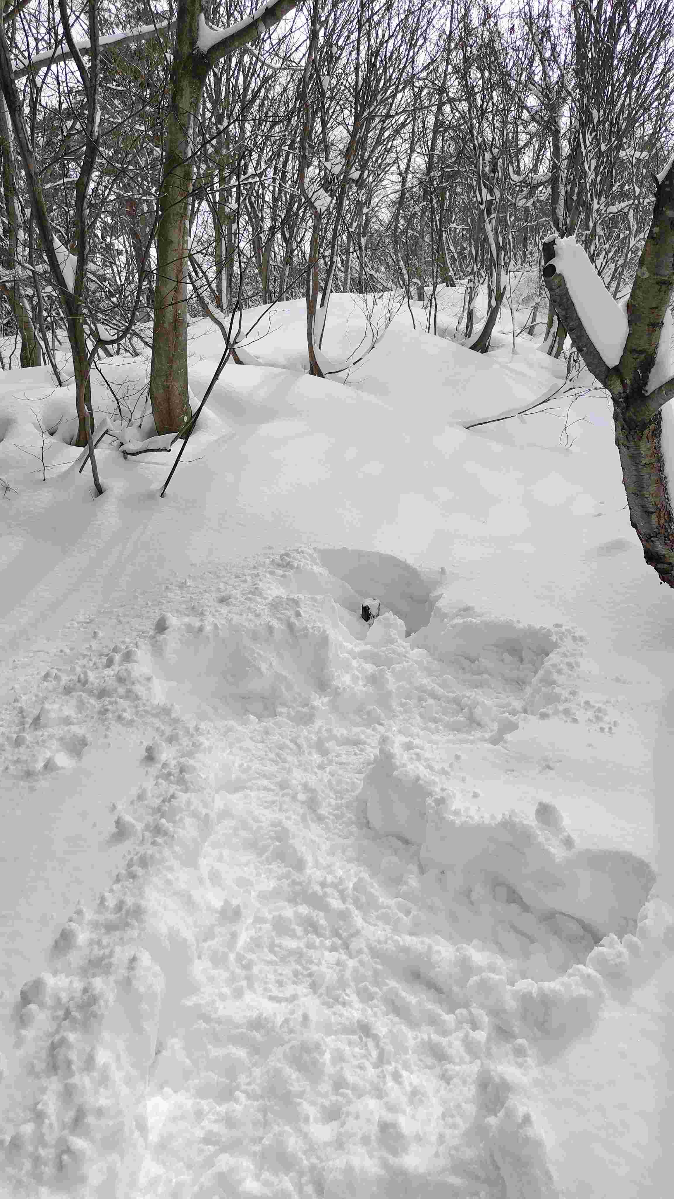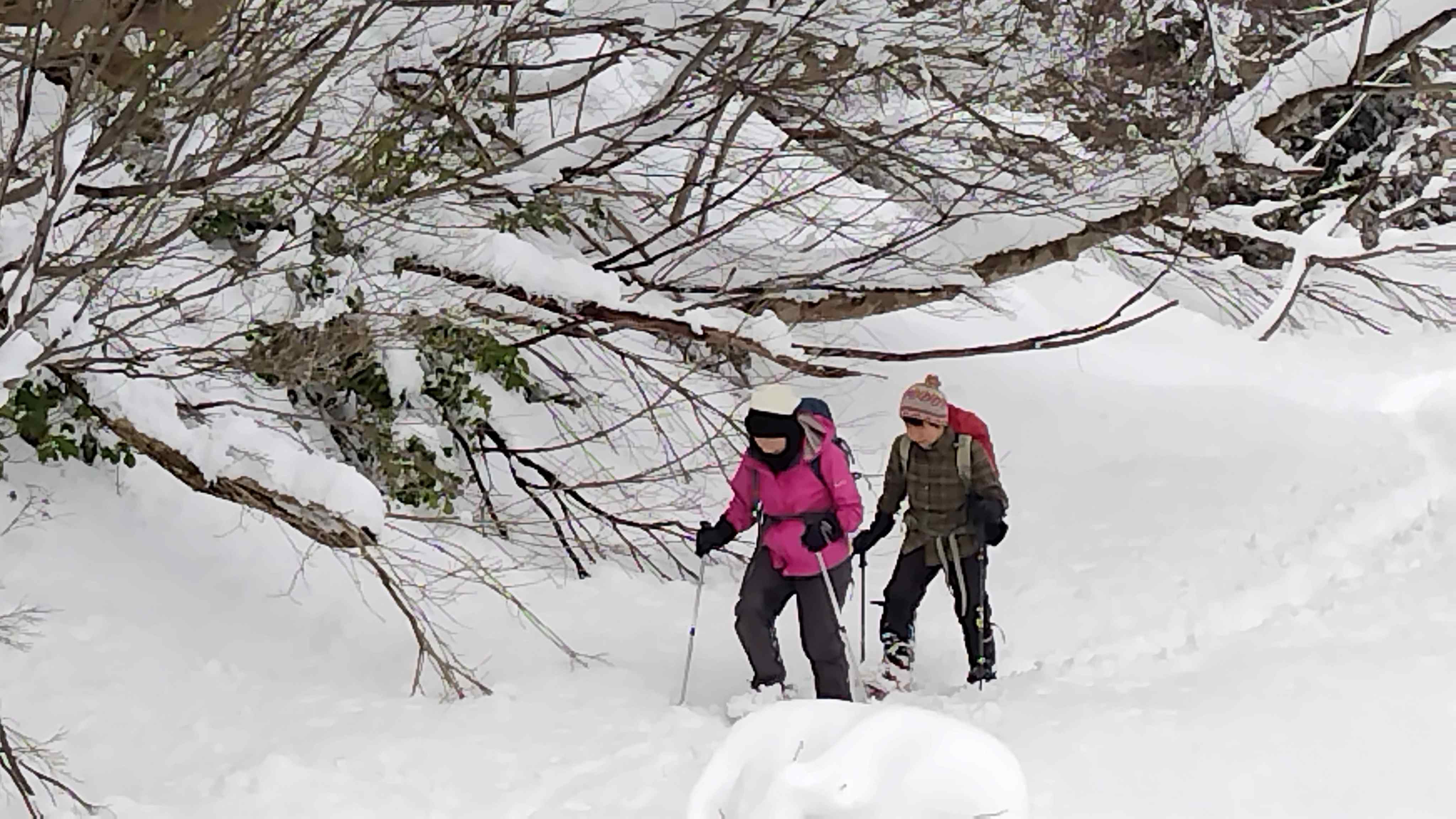 このあたりから雪も深くなり、気温も上がって重いラッセルとなる。ヤブを避けながらルートをとる。
